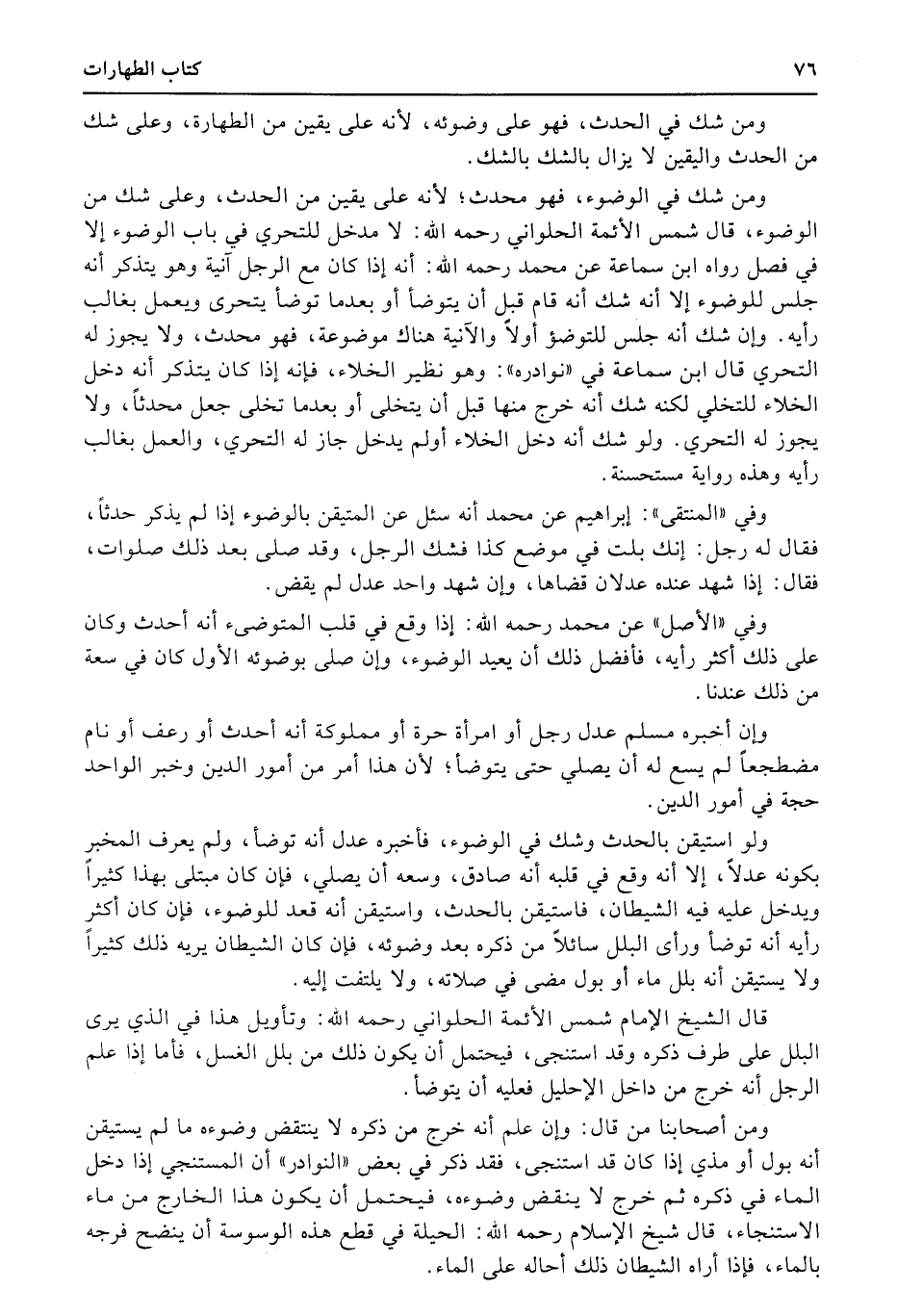 ومن شك في الوضوء، فهو محدث؛ لأنه على يقين من الحدث، وعلى شك من الوضوء، قال شمس الأئمة الحلواني رحمه الله: لا مدخل للتحري في باب الوضوء إلا في فصل رواه ابن سماعة عن محمد رحمه الله: أنه إذا كان مع الرجل آنية وهو يتذكر أنه جلس للوضوء إلا أنه شك أنه قام قبل أن يتوضأ أو بعدما توضأ يتحرى ويعمل بغالب رأيه.