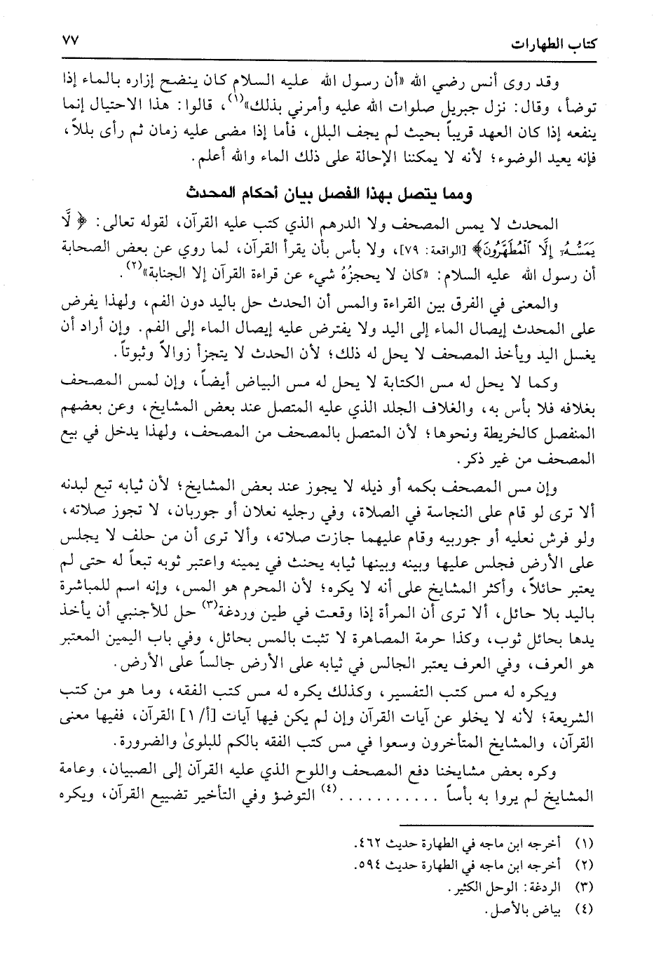 المحدث لا يمس المصحف ولا الدرهم الذي كتب عليه القرآن، لقوله تعالى: {لا يمسه إلا المطهرون} (الواقعة: 79) ، ولا بأس بأن يقرأ القرآن، لما روي عن بعض الصحابة أن رسول الله عليه السلام: «كان لا يحجزُهُ شيء عن قراءة القرآن إلا الجنابة» .