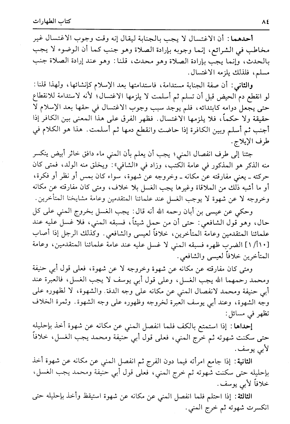 وحكي عن عيسى بن أبان رحمه الله أنه قال: يجب الغسل بخروج المني على كل حال، وهو قول الشافعي: حتى إن من حمل شيئاً، فسبقه المني، فلا غسل عليه عند علمائنا المتقدمين وعامة المتأخرين، خلافاً لعيسى والشافعي. وكذلك الرجل إذا أصاب (10أ1) الضرب ظهره فسبقه المني لا غسل عليه عند عامة علمائنا المتقدمين، وعامة المتأخرين خلافاً لعيسى والشافعي.