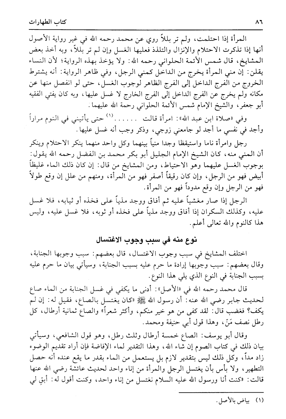 اختلف المشايخ في سبب وجوب الاغتسال، قال بعضهم: سبب وجوبها الجنابة، وقال بعضهم: سبب وجوبها إرادة ما حرم عليه بسبب الجنابة، وسيأتي بيان ما حرم عليه بسبب الجنابة في النوع الذي يلي هذا النوع.