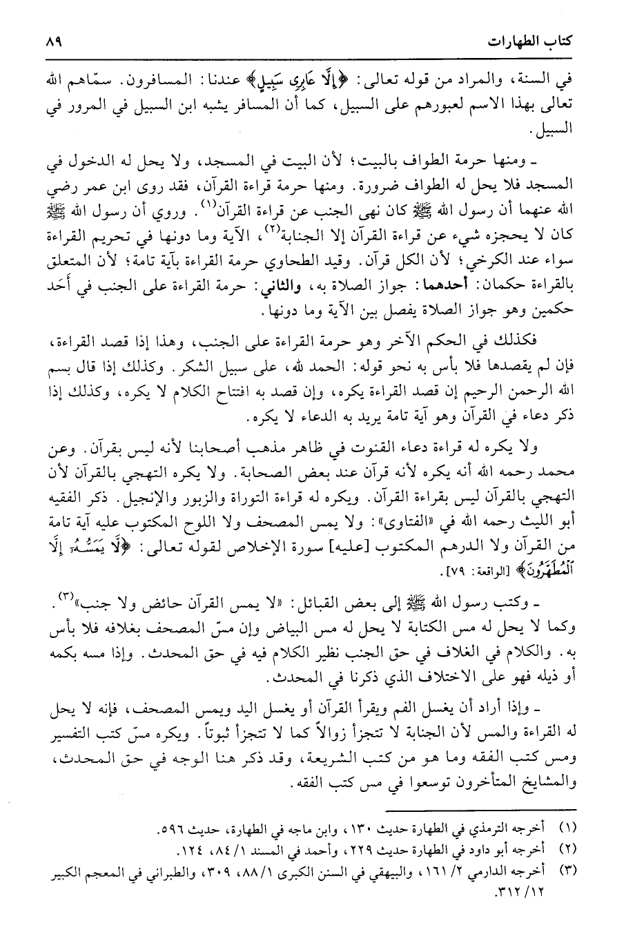 ومنها حرمة الطواف بالبيت؛ لأن البيت في المسجد، ولا يحل له الدخول في المسجد فلا يحل له الطواف ضرورة. ومنها حرمة قراءة القرآن، فقد روى ابن عمر رضي الله عنهما أن رسول الله صلى الله عليه وسلّمكان نهى الجنب عن قراءة القرآن. وروي أن رسول الله صلى الله عليه وسلّمكان لا يحجزه شيء عن قراءة القرآن إلا الجنابة، الآية وما دونها في تحريم القراءة سواء عند الكرخي؛ لأن الكل قرآن. وقيد الطحاوي حرمة القراءة بآية تامة؛ لأن المتعلق بالقراءة حكمان: أحدهما: جواز الصلاة به، والثاني: حرمة القراءة على الجنب في أَحَد حكمين وهو جواز الصلاة يفصل بين الآية وما دونها. /