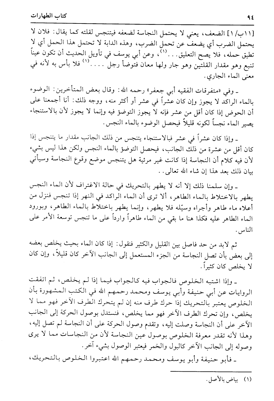(11ب1) الضعف، يعني لا يحتمل النجاسة لضعفه فيتنجس لقلته كما يقال: فلان لا يحتمل الضرب أي يضعف عن تحمل الضرب، وهذه الدابة لا تحتمل هذا الحمل أي لا تطيق حمله، فلا يصح التعليق ... ، وعن أبي يوسف في تأويل الحديث أن تكون عيناً تنبع وهو مقدار القلتين وهو جار ولها معان فتوضأ رجل.... فلا بأس به لأنه في معنى الماء الجاري.