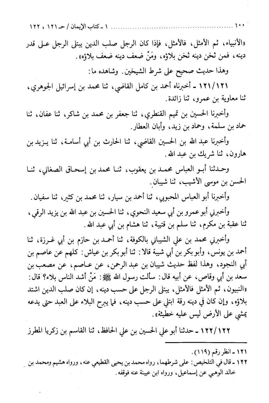 121 - أَخْبَرْنَاهُ أَحْمَدُ بْنُ كَامِلٍ الْقَاضِي، ثنا مُحَمَّدُ بْنُ إِسْرَائِيلَ الْجَوْهَرِيُّ، ثنا مُعَاوِيَةُ بْنُ عَمْرٍو، ثنا زَائِدَةُ، وَأَخْبَرَنَا أَبُوْ الْحُسَيْنُ بْنُ تَمِيمٍ الْقَنْطَرِيُّ، ثنا جَعْفَرُ بْنُ مُحَمَّدِ بْنِ شَاكِرٍ، ثنا عَفَّانُ، ثنا حَمَّادُ بْنُ سَلَمَةَ، وَحَمَّادُ بْنُ زَيْدٍ، وَأَبَانُ الْعَطَّارُ، وَأَخْبَرَنَا عَبْدُ اللَّهِ بْنُ الْحُسَيْنِ الْقَاضِي، ثنا الْحَارِثُ بْنُ أَبِي أُسَامَةَ، ثنا يَزِيدُ بْنُ هَارُونَ، ثنا شَرِيكُ بْنُ عَبْدِ اللَّهِ، وَحدثنا أَبُو الْعَبَّاسِ مُحَمَّدُ بْنُ يَعْقُوبَ، ثنا مُحَمَّدُ بْنُ إِسْحَاقَ الصَّغَانِيُّ، ثنا الْحَسَنُ بْنُ مُوسَى الْأَشْيَبُ، ثنا شَيْبَانُ، وَأَخْبَرَنَا أَبُو الْعَبَّاسِ الْمَحْبُوبِيُّ، ثنا أَحْمَدُ بْنُ سَيَّارٍ، ثنا مُحَمَّدُ بْنُ كَثِيرٍ، ثنا سُفْيَانُ، وَأَخْبَرَنِي أَبُو عَمْرِو بْنِ أَبِي سَعِيدٍ النَّحْوِيُّ، ثنا الْحُسَيْنُ بْنُ عَبْدِ اللَّهِ بْنِ يَزِيدَ الرَّقِّيُّ، ثنا عُقْبَةُ بْنُ مُكْرَمٍ، ثنا سَلْمُ بْنُ قُتَيْبَةَ، ثنا هِشَامُ بْنُ أَبِي عَبْدِ اللَّهِ، وَأَخْبَرَنِي مُحَمَّدُ بْنُ عَلِيٍّ الشَّيْبَانِيُّ، بِالْكُوفَةِ، ثنا أَحْمَدُ بْنُ حَازِمِ بْنِ أَبِي غَرَزَةَ، ثنا أَحْمَدُ بْنُ يُونُسَ، وَأَبُو بَكْرِ بْنُ أَبِي شَيْبَةَ، قَالَا: ثنا أَبُو بَكْرِ بْنُ عَيَّاشٍ، كُلُّهُمْ عَنْ عَاصِمِ بْنِ أَبِي النَّجُودِ، وَهَذَا لَفْظُ حَدِيثِ شَيْبَانَ بْنِ عَبْدِ الرَّحْمَنِ، عَنْ عَاصِمٍ، عَنْ مُصْعَبِ بْنِ سَعْدِ بْنِ أَبِي وَقَّاصٍ، عَنْ أَبِيهِ، قَالَ: سَأَلْتُ رَسُولَ اللَّهِ صَلَّى اللهُ عَلَيْهِ وَسَلَّمَ: مَنْ أَشَدُّ النَّاسِ بَلَاءً؟ قَالَ: «النَّبِيُّونَ، ثُمَّ الْأَمْثَلُ فَالْأَمْثَلُ §يُبْتَلَى الرَّجُلُ عَلَى حَسَبِ دِينِهِ، إِنْ كَانَ صُلْبَ الدِّينِ اشْتَدَّ بَلَاؤُهُ، وَإِنْ كَانَ فِي دِينِهِ رِقَّةٌ ابْتُلِيَ عَلَى حَسَبِ دِينِهِ، فَمَا يَبْرَحُ الْبَلَاءُ عَلَى الْعَبْدِ حَتَّى يَدَعَهُ يَمْشِي عَلَى الْأَرْضِ لَيْسَ عَلَيْهِ خَطِيئَةٌ»