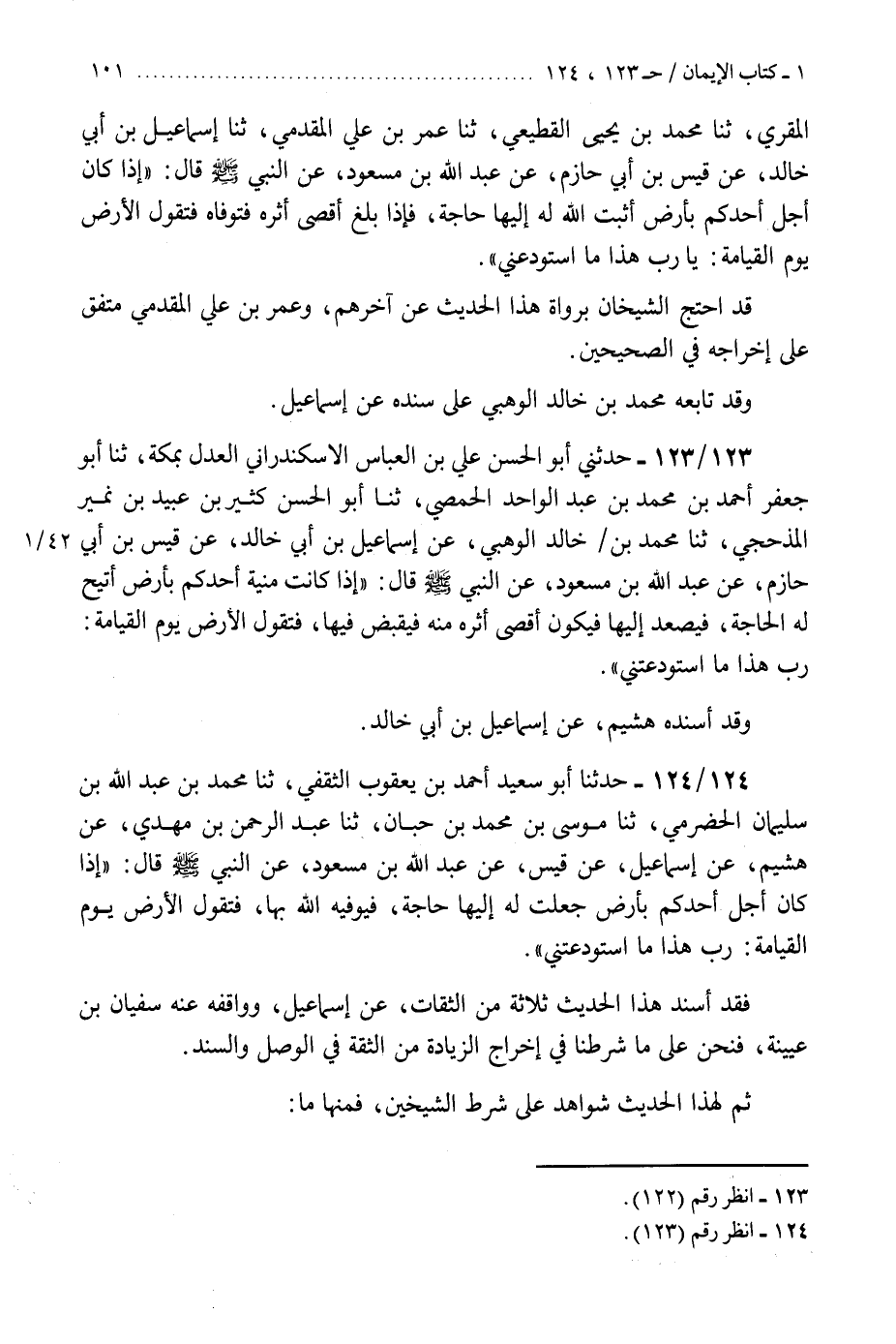 124 - حَدَّثَنَا أَبُو سَعِيدٍ أَحْمَدُ بْنُ يَعْقُوبَ الثَّقَفِيُّ، ثنا مُحَمَّدُ بْنُ عَبْدِ اللَّهِ بْنِ سُلَيْمَانَ الْحَضْرَمِيُّ، ثنا مُوسَى بْنُ مُحَمَّدِ بْنِ حِبَّانَ، ثنا عَبْدُ الرَّحْمَنِ بْنُ مَهْدِيٍّ، عَنْ هُشَيْمٍ، عَنْ إِسْمَاعِيلَ، عَنْ قَيْسٍ، عَنْ عَبْدِ اللَّهِ بْنِ مَسْعُودٍ، عَنِ النَّبِيِّ صَلَّى اللهُ عَلَيْهِ وَسَلَّمَ، قَالَ: §إِذَا كَانَ أَجَلُ أَحَدِكُمْ بِأَرْضٍ جُعِلَتْ لَهُ إِلَيْهَا حَاجَةٌ، فَيُوَفِّيهِ اللَّهُ بِهَا فَتَقُولُ الْأَرْضُ يَوْمَ الْقِيَامَةِ: رَبِّ هَذَا مَا اسْتَوْدَعْتَنِي «.» فَقَدْ أَسْنَدَ هَذَا الْحَدِيثَ ثَلَاثَةٌ مِنَ الثِّقَاتِ عَنْ إِسْمَاعِيلَ، وَوَافَقَهُ عَنْهُ سُفْيَانُ بْنُ عُيَيْنَةَ، فَنَحْنُ عَلَى مَا شَرَطْنَا فِي إِخْرَاجِ الزِّيَادَةِ مِنَ الثِّقَةِ فِي الْوَصْلِ وَالسَّنَدِ، ثُمَّ لِهَذَا الْحَدِيثِ شَوَاهِدُ عَلَى شَرْطِ الشَّيْخَيْنِ فَمِنْهَا مَا "