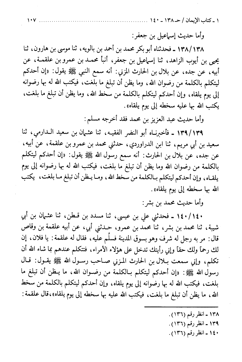 138 - فَحَدَّثَنَاهُ أَبُو بَكْرٍ مُحَمَّدُ بْنُ أَحْمَدَ بْنِ بَالَوَيْهِ، ثنا مُوسَى بْنُ هَارُونَ، ثنا يَحْيَى بْنُ أَيُّوبَ الزَّاهِدُ، ثنا إِسْمَاعِيلُ بْنُ جَعْفَرٍ، أَنْبَأَ مُحَمَّدُ بْنُ عَمْرِو بْنِ عَلْقَمَةَ، عَنْ أَبِيهِ، عَنْ جَدِّهِ، عَنْ بِلَالِ بْنِ الْحَارِثِ الْمُزَنِيِّ، أَنَّهُ سَمِعَ النَّبِيَّ صَلَّى اللهُ عَلَيْهِ وَسَلَّمَ، يَقُولُ: «إِنَّ §أَحَدَكُمْ لَيَتَكَلَّمُ بِالْكَلِمَةِ مِنْ رِضْوَانِ اللَّهِ، وَمَا يَظُنُّ أَنْ تَبْلُغَ مَا بَلَغَتْ فَيُكْتَبُ اللَّهُ لَهُ بِهَا رِضْوَانَهُ إِلَى يَوْمِ يَلْقَاهُ، وَإِنَّ أَحَدَكُمْ لَيَتَكَلَّمُ بِالْكَلِمَةِ مِنْ سَخَطِ اللَّهِ، وَمَا يَظُنُّ أَنْ تَبْلُغَ مَا بَلَغَتْ يَكْتُبُ اللَّهُ بِهَا عَلَيْهِ سَخَطَهُ إِلَى يَوْمِ يَلْقَاهُ» . «وَأَمَّا حَدِيثُ عَبْدِ الْعَزِيزِ بْنِ مُحَمَّدٍ فَقَدْ أَخْرَجَهُ مُسْلِمٌ»