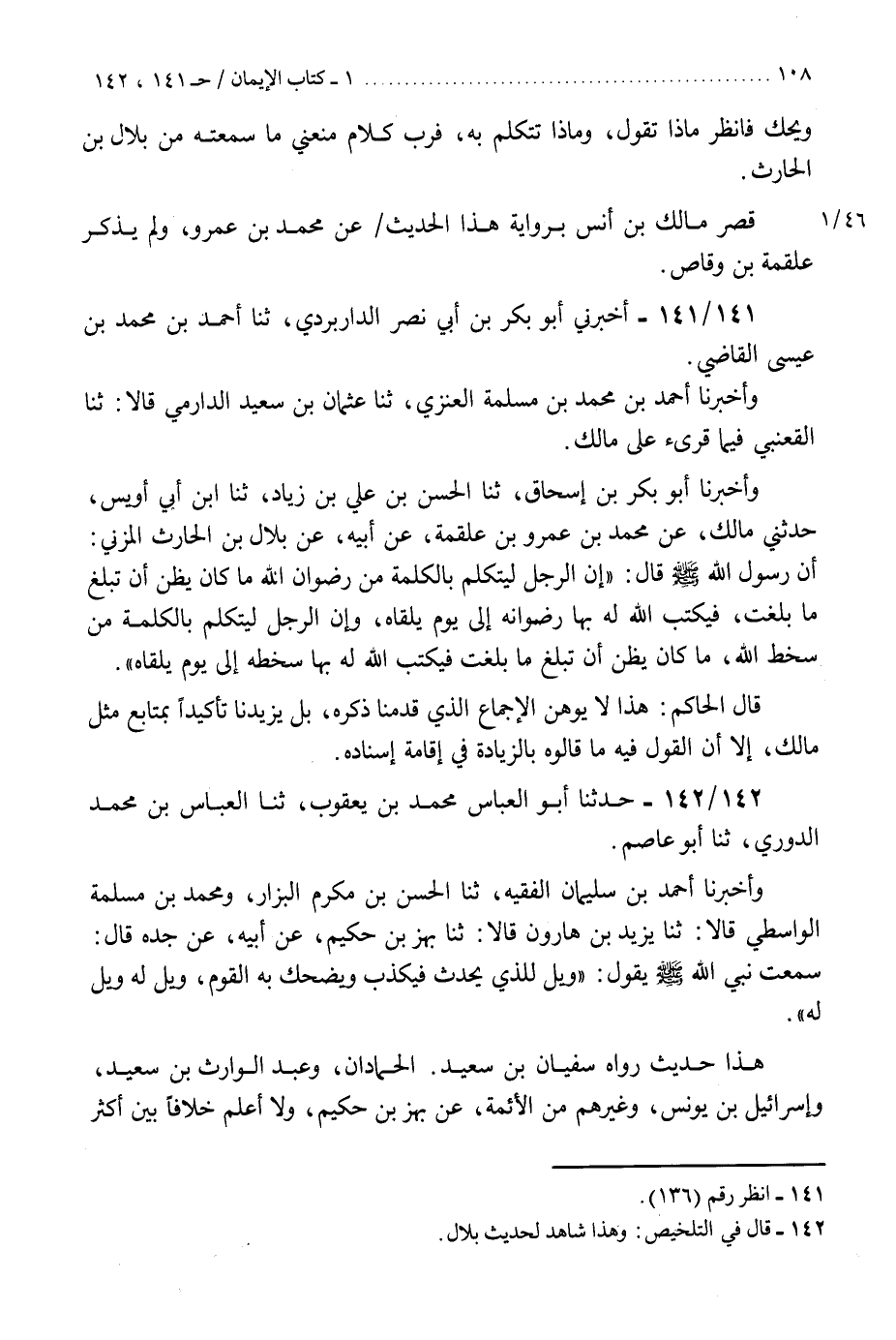 141 - أَخْبَرَنِي أَبُو بَكْرِ بْنُ أَبِي نَصْرٍ الدَّارَبَرْدِيُّ، ثنا أَحْمَدُ بْنُ مُحَمَّدِ بْنِ عِيسَى الْقَاضِي، وَأَخْبَرَنَا أَحْمَدُ بْنُ مُحَمَّدِ بْنِ مَسْلَمَةَ الْعَنَزِيُّ، ثنا عُثْمَانُ بْنُ سَعِيدٍ الدَّارِمِيُّ، قَالَا: ثنا الْقَعْنَبِيُّ، فِيمَا قُرِئَ عَلَى مَالِكٍ، وَأَخْبَرَنَا أَبُو بَكْرِ بْنُ إِسْحَاقَ، ثنا الْحَسَنُ بْنُ عَلِيِّ بْنِ زِيَادٍ، ثنا ابْنُ أَبِي أُوَيْسٍ، حَدَّثَنِي مَالِكٌ، عَنْ مُحَمَّدِ بْنِ عَمْرِو بْنِ عَلْقَمَةَ، عَنْ أَبِيهِ، عَنْ بِلَالِ بْنِ الْحَارِثِ الْمُزَنِيِّ، أَنَّ رَسُولَ اللَّهِ صَلَّى اللهُ عَلَيْهِ وَسَلَّمَ، قَالَ: «إِنَّ §الرَّجُلَ لَيَتَكَلَّمُ بِالْكَلِمَةِ مِنْ رِضْوَانِ اللَّهِ، مَا كَانَ يَظُنُّ أَنْ تَبْلُغَ مَا بَلَغَتْ فَيُكْتَبُ اللَّهُ لَهُ بِهَا رِضْوَانَهُ إِلَى يَوْمِ يَلْقَاهُ، وَإِنَّ الرَّجُلَ لَيَتَكَلَّمُ بِالْكَلِمَةِ مِنْ سَخَطِ اللَّهِ، مَا كَانَ يَظُنُّ أَنْ تَبْلُغَ مَا بَلَغَتْ فَيُكْتَبُ اللَّهُ لَهُ بِهَا سَخَطَهُ إِلَى يَوْمِ يَلْقَاهُ» . قَالَ الْحَاكِمُ: «هَذَا لَا يُوهِنُ الْإِجْمَاعَ الَّذِي قَدَّمْنَا ذِكْرَهُ بَلْ يَزِيدُنَا تَأْكِيدًا بِمُتَابِعٍ مِثْلِ مَالِكٍ، إِلَّا أَنَّ الْقَوْلَ فِيهِ مَا قَالُوهُ بِالزِّيَادَةِ فِي إِقَامَةِ إِسْنَادِهِ»