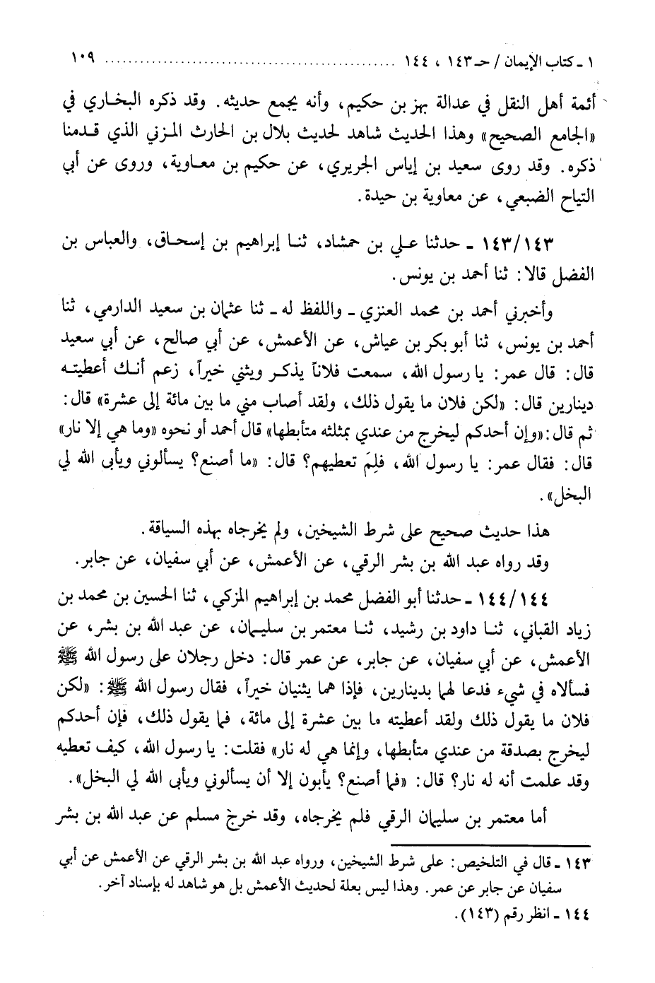 143 - حَدَّثَنَا عَلِيُّ بْنُ حَمْشَاذَ، ثنا إِبْرَاهِيمُ بْنُ إِسْحَاقَ، وَالْعَبَّاسُ بْنُ الْفَضْلِ، قَالَا: ثنا أَحْمَدُ بْنُ يُونُسَ، وَأَخْبَرَنِي أَحْمَدُ بْنُ مُحَمَّدٍ الْعَنَزِيُّ، وَاللَّفْظُ لَهُ، ثنا عُثْمَانُ بْنُ سَعِيدٍ الدَّارِمِيُّ، ثنا أَحْمَدُ بْنُ يُونُسَ، ثنا أَبُو بَكْرِ بْنُ عَيَّاشٍ، عَنِ الْأَعْمَشِ، عَنْ أَبِي صَالِحٍ، عَنْ أَبِي سَعِيدٍ، قَالَ: قَالَ عُمَرُ: يَا رَسُولَ اللَّهِ، سَمِعْتُ فُلَانًا يَذْكُرُ وَيُثْنِي خَيْرًا، زَعَمَ أَنَّكَ أَعْطَيْتَهُ دِينَارَيْنِ، قَالَ: «لَكِنْ فُلَانٌ مَا يَقُولُ ذَلِكَ، وَلَقَدْ أَصَابَ مِنِّي مَا بَيْنَ مِائَةٍ إِلَى عَشَرَةٍ» قَالَ: ثُمَّ قَالَ: «وَإِنَّ §أَحَدَكُمْ لَيَخْرُجُ مِنْ عِنْدِي بِمَسْأَلَتِهِ مُتَأَبِّطُهَا» قَالَ أَحْمَدُ: أَوْ نَحْوَهُ «وَمَا هِيَ إِلَّا نَارٌ» قَالَ: فَقَالَ عُمَرُ: يَا رَسُولَ اللَّهِ، فَلِمَ تُعْطِيهُمْ؟ قَالَ: «مَا أَصْنَعُ؟ يَسْأَلُونِي وَيَأْبَى اللَّهُ لِيَ الْبُخْلَ» . «هَذَا حَدِيثٌ صَحِيحٌ عَلَى شَرْطِ الشَّيْخَيْنِ، وَلَمْ يُخَرِّجَاهُ بِهَذِهِ السِّيَاقَةِ» . وَقَدْ رَوَاهُ عَبْدُ اللَّهِ بْنُ بِشْرٍ الرَّقِّيُّ، عَنِ الْأَعْمَشِ، عَنْ أَبِي سُفْيَانَ، عَنْ جَابِرٍK143 - على شرط الشيخين