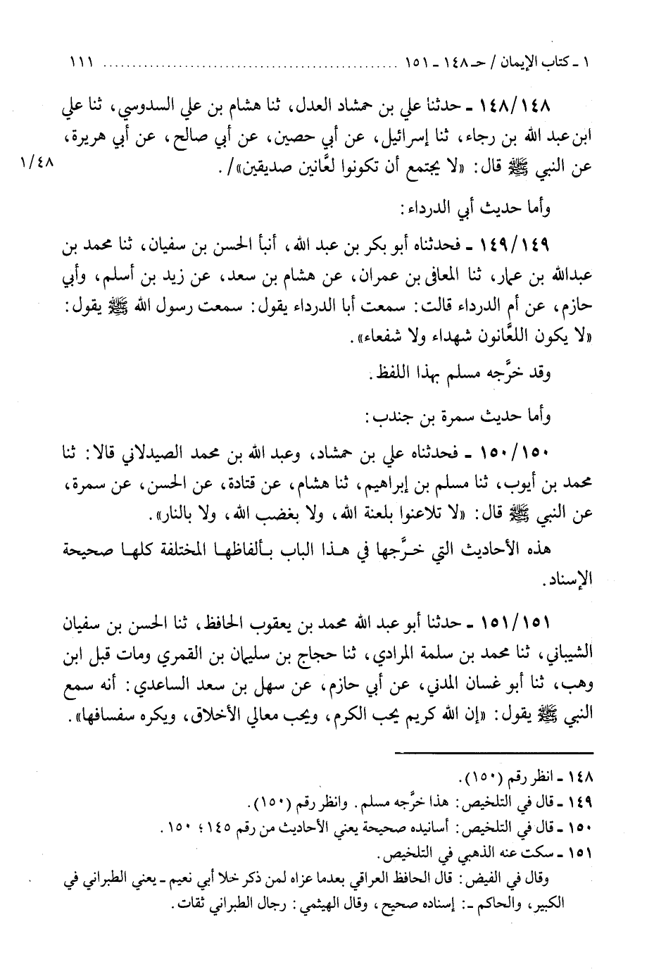 148 - حَدَّثَنَا عَلِيُّ بْنُ حَمْشَاذَ الْعَدْلُ، ثنا هِشَامُ بْنُ عَلِي السَّدُوسِي، ثنا عَبْدِ اللَّهِ بْنِ رَجَاءٍ، ثنا إِسْرَائِيلُ، عَنْ أَبِي حَصِينٍ، عَنْ أَبِي صَالِحٍ، عَنْ أَبِي هُرَيْرَةَ، عَنِ النَّبِيِّ صَلَّى اللهُ عَلَيْهِ وَسَلَّمَ، قَالَ: §«لَا يَجْتَمِعُ أَنْ تَكُونُوا لَعَّانِينَ صِدِّيقِينَ»