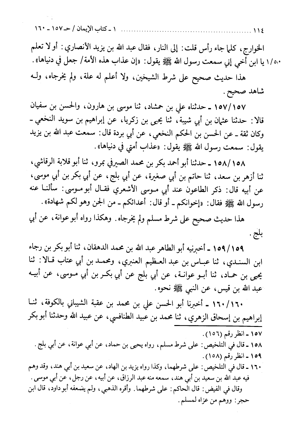 158 - حَدَّثَنَا أَبُو أَحْمَدَ بَكْرُ بْنُ مُحَمَّدٍ الصَّيْرَفِيُّ، بِمَرْوَ، ثنا أَبُو قِلَابَةَ الرَّقَاشِيُّ، ثنا أَزْهَرُ بْنُ سَعْدٍ، ثنا حَاتِمُ بْنُ أَبِي صَغِيرَةَ، عَنْ أَبِي بَلْجٍ، عَنْ أَبِي بَكْرِ بْنِ أَبِي مُوسَى، عَنْ أَبِيهِ، قَالَ: ذُكِرَ الطَّاعُونُ عِنْدَ أَبِي مُوسَى الْأَشْعَرِيِّ، فَقَالَ أَبُو مُوسَى: سَأَلْنَا عَنْهُ رَسُولَ اللَّهِ صَلَّى اللهُ عَلَيْهِ وَسَلَّمَ، فَقَالَ: " §إِخْوَانِكُمْ - أَوْ قَالَ: أَعْدَاؤُكُمْ - مِنَ الْجِنِّ وَهُوَلَكُمْ شَهَادَةٌ «.» هَذَا حَدِيثٌ صَحِيحٌ عَلَى شَرْطِ مُسْلِمٍ، وَلَمْ يُخَرِّجَاهُ ". وَهَكَذَا رَوَاهُ أَبُو عَوَانَةَ، عَنْ أَبِي بَلْجٍ.