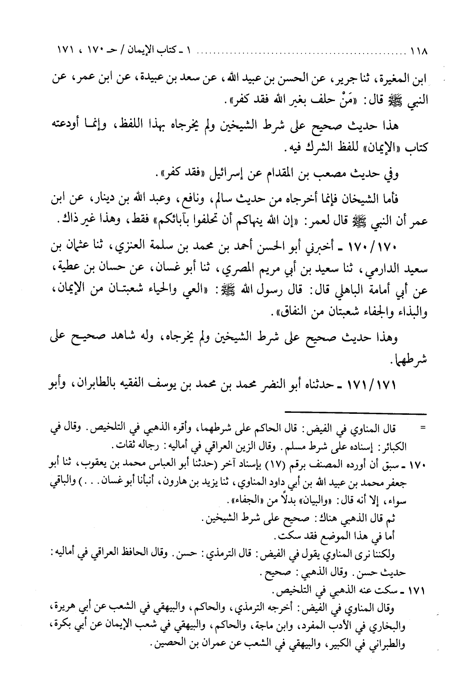170 - أَخْبَرَنِي أَبُو الْحَسَنِ أَحْمَدُ بْنُ مُحَمَّدِ بْنِ سَلَمَةَ الْعَنَزِيُّ، ثنا عُثْمَانُ بْنُ سَعِيدٍ الدَّارِمِيُّ، ثنا سَعِيدُ بْنُ أَبِي مَرْيَمَ الْمِصْرِيُّ، ثنا أَبُو غَسَّانَ، عَنْ حَسَّانَ بْنِ عَطِيَّةَ، عَنْ أَبِي أُمَامَةَ الْبَاهِلِيِّ، قَالَ: قَالَ رَسُولُ اللَّهِ صَلَّى اللهُ عَلَيْهِ وَسَلَّمَ: " §الْعِيُّ وَالْحَيَاءُ: شُعْبَتَانِ مِنَ الْإِيمَانِ، وَالْبَذَاءُ وَالْجَفَاءُ: شُعْبَتَانِ مِنَ النِّفَاقِ «.» وَهَذَا حَدِيثٌ صَحِيحٌ عَلَى شَرْطِ الشَّيْخَيْنِ، وَلَمْ يُخَرِّجَاهُ وَلَهُ شَاهِدٌ صَحِيحٌ عَلَى شَرْطِهِمَا "