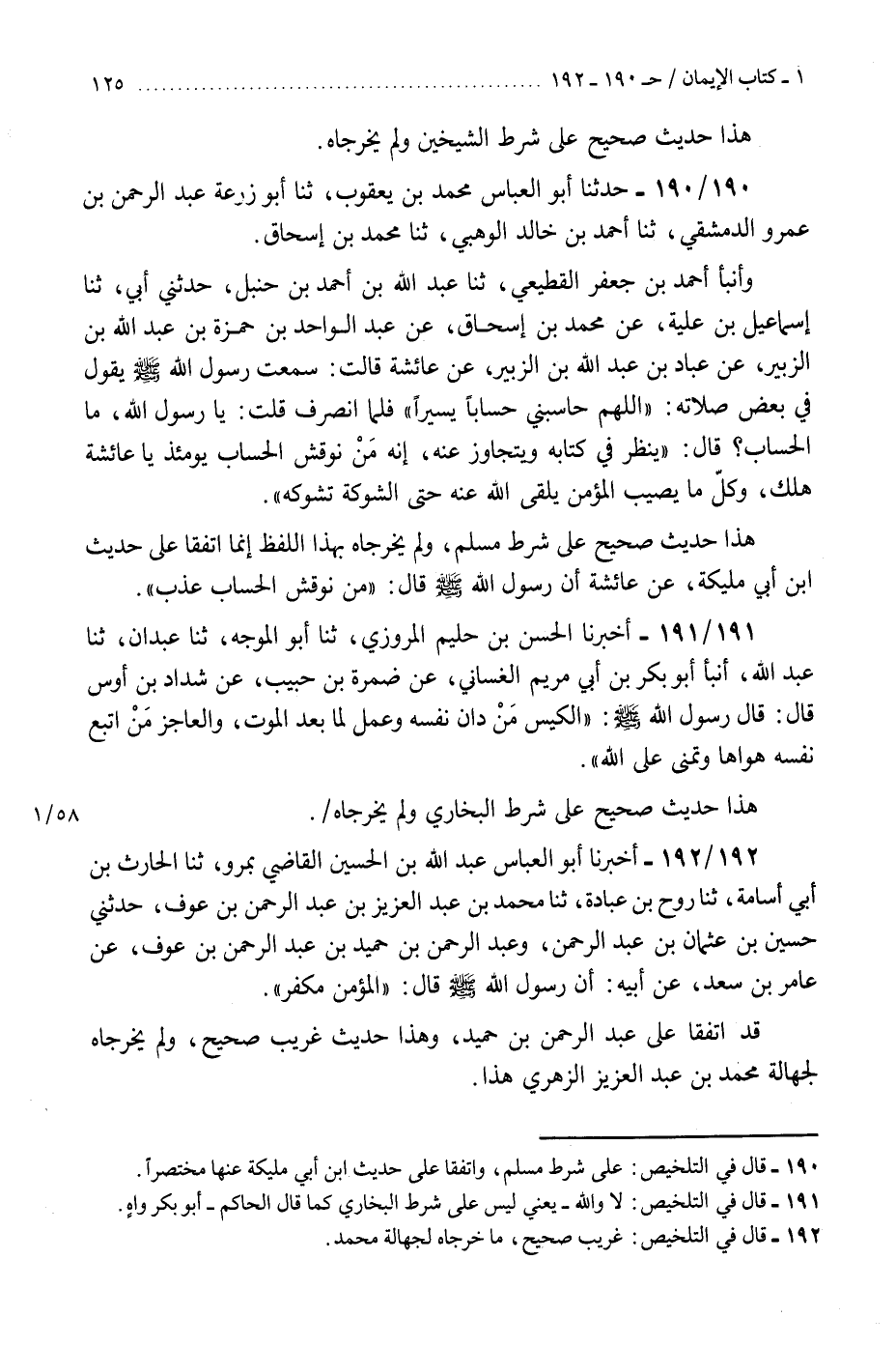 190 - حَدَّثَنَا أَبُو الْعَبَّاسِ مُحَمَّدُ بْنُ يَعْقُوبَ، ثنا أَبُو زُرْعَةَ عَبْدُ الرَّحْمَنِ بْنُ عَمْرٍو الدِّمَشْقِيُّ، ثنا أَحْمَدُ بْنُ خَالِدٍ الْوَهْبِيُّ، ثنا مُحَمَّدُ بْنُ إِسْحَاقَ، وَأَنْبَأَ أَحْمَدُ بْنُ جَعْفَرٍ الْقَطِيعِيُّ، ثنا عَبْدُ اللَّهِ بْنُ أَحْمَدَ بْنِ حَنْبَلٍ، حَدَّثَنِي أَبِي، ثنا إِسْمَاعِيلُ بْنُ عُلَيَّةَ، عَنْ مُحَمَّدِ بْنِ إِسْحَاقَ، عَنْ عَبْدِ الْوَاحِدِ بْنِ حَمْزَةِ بْنِ عَبْدِ اللَّهِ بْنِ الزُّبَيْرِ، عَنْ عَبَّادِ بْنِ عَبْدِ اللَّهِ بْنِ الزُّبَيْرِ، عَنْ عَائِشَةَ، قَالَتْ: سَمِعْتُ رَسُولَ اللَّهِ صَلَّى اللهُ عَلَيْهِ وَسَلَّمَ، يَقُولُ فِي بَعْضِ صَلَاتِهِ: «§اللَّهُمَّ حَاسِبْنِي حِسَابًا يَسِيرًا» فَلَمَّا انْصَرَفَ قُلْتُ: يَا رَسُولَ اللَّهِ، مَا الْحِسَابُ، قَالَ: «يُنْظَرُ فِي كِتَابِهِ وَيُتَجَاوَزُ عَنْهُ، إِنَّهُ مَنْ نُوقِشَ الْحِسَابَ يَوْمَئِذٍ يَا عَائِشَةُ هَلَكَ، وَكُلُّ مَا يُصِيبُ الْمُؤْمِنَ يُلْقِي اللَّهُ عَنْهُ حَتَّى الشَّوْكَةَ تَشُوكُهُ» . " هَذَا حَدِيثٌ صَحِيحٌ عَلَى شَرْطِ مُسْلِمٍ وَلَمْ يُخَرِّجَاهُ بِهَذَا اللَّفْظِ، إِنَّمَا اتَّفَقَا عَلَى حَدِيثِ ابْنِ أَبِي مُلَيْكَةَ، عَنْ عَائِشَةَ، أَنَّ رَسُولَ اللَّهِ صَلَّى اللهُ عَلَيْهِ وَسَلَّمَ، قَالَ: «مَنْ نُوقِشَ الْحِسَابَ عُذِّبَ» K190 - على شرط مسلم
