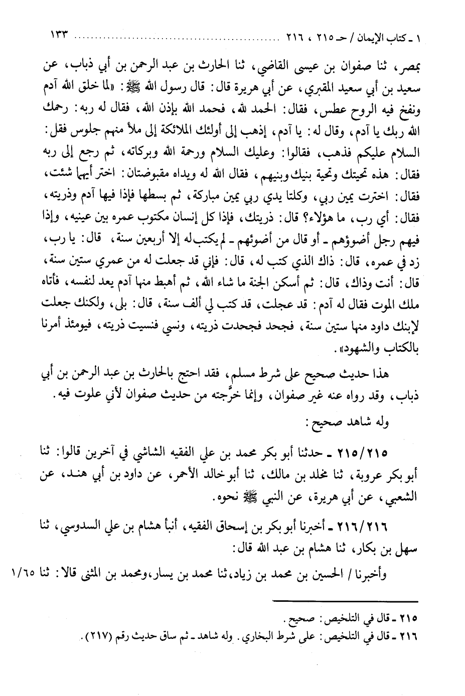 216 - أَخْبَرَنَا أَبُو بَكْرِ بْنُ إِسْحَاقَ الْفَقِيهُ، أَنْبَأَ هِشَامُ بْنُ عَلِيٍّ السَّدُوسِيُّ، ثنا سَهْلُ بْنُ بَكَّارٍ، ثنا هِشَامُ بْنُ عَبْدِ اللَّهِ، قَالَ: وَأَخْبَرَنَا الْحُسَيْنُ بْنُ مُحَمَّدِ بْنِ زِيَادٍ، ثنا مُحَمَّدُ بْنُ بَشَّارٍ، وَمُحَمَّدُ بْنُ الْمُثَنَّى، قَالَا: ثنا مُعَاذُ بْنُ هِشَامٍ، حَدَّثَنِي أَبِي، عَنْ قَتَادَةَ، عَنْ عِكْرِمَةَ، عَنِ ابْنِ عَبَّاسٍ رَضِيَ اللَّهُ عَنْهُمَا، قَالَ: «§أَتَعْجَبُونَ أَنْ يَكُونَ الْخُلَّةُ لِإِبْرَاهِيمَ، وَالْكَلَامُ لِمُوسَى، وَالرُّؤْيَةُ لِمُحَمَّدٍ صَلَّى اللهُ عَلَيْهِ وَسَلَّمَ» . «هَذَا حَدِيثٌ صَحِيحٌ عَلَى شَرْطِ الْبُخَارِيِّ، وَلَمْ يُخَرِّجَاهُ، وَلَهُ شَاهِدٌ صَحِيحٌ، عَنْ ابْنِ عَبَّاسٍ فِي الرُّؤْيَةِ» K216 - على شرط البخاري
