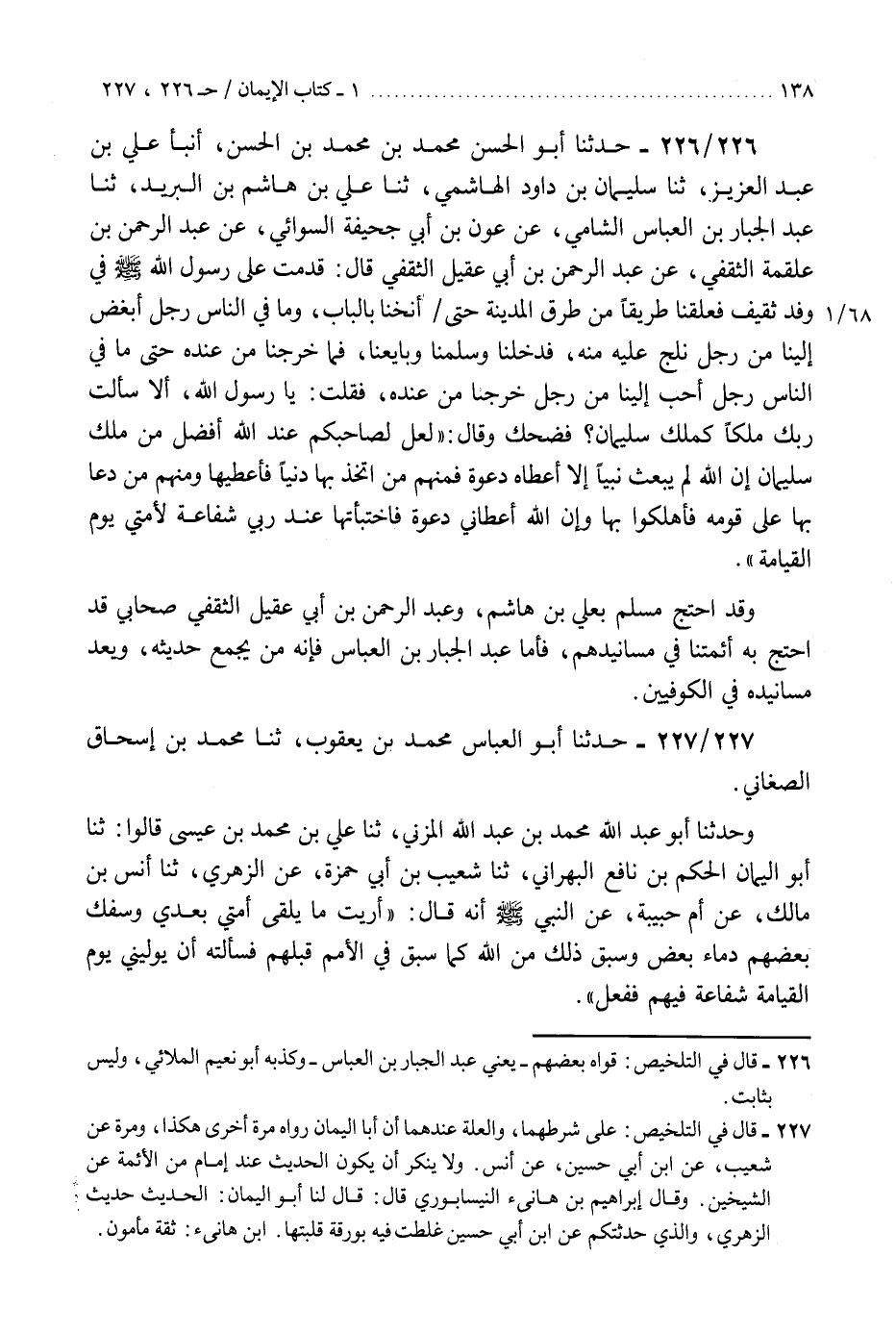 226 - حَدَّثَنَا أَبُو الْحَسَنِ مُحَمَّدُ بْنُ مُحَمَّدِ بْنِ الْحَسَنِ، أَنْبَأَ عَلِيُّ بْنُ عَبْدِ الْعَزِيزِ، ثنا سُلَيْمَانُ بْنُ دَاوُدَ الْهَاشِمِيُّ، ثنا عَلِيُّ بْنُ هَاشِمِ بْنِ الْبَرِيدِ، ثنا عَبْدُ الْجَبَّارِ بْنُ الْعَبَّاسِ الشَّبَامِيُّ، عَنْ عَوْنِ بْنِ أَبِي جُحَيْفَةَ السُّوَائِيُّ، عَنْ عَبْدِ الرَّحْمَنِ بْنِ عَلْقَمَةَ الثَّقَفِيِّ، عَنْ عَبْدِ الرَّحْمَنِ بْنِ أَبِي عَقِيلٍ الثَّقَفِيِّ، قَالَ: قَدِمْتُ عَلَى رَسُولِ اللَّهِ صَلَّى اللهُ عَلَيْهِ وَسَلَّمَ فِي وَفْدِ ثَقِيفٍ، فَعَلَقْنَا طَرِيقًا مِنْ طُرُقِ الْمَدِينَةِ حَتَّى أَنَخْنَا بِالْبَابِ، وَمَا فِي النَّاسِ رَجُلٌ أَبْغَضُ إِلَيْنَا مِنْ رَجُلٍ نَلِجُ عَلَيْهِ مِنْهُ، فَدَخَلْنَا وَسَلَّمْنَا وَبَايَعْنَا، فَمَا خَرَجْنَا مِنْ عِنْدِهِ حَتَّى مَا فِي النَّاسِ رَجُلٌ أَحَبُّ إِلَيْنَا مِنْ رَجُلٍ خَرَجْنَا مِنْ عِنْدِهِ، فَقُلْتُ: يَا رَسُولَ اللَّهِ، أَلَا سَأَلْتَ رَبَّكَ مُلْكًا كَمُلْكِ سُلَيْمَانَ؟ فَضَحِكَ وَقَالَ: «لَعَلَّ صَاحِبَكُمْ عِنْدَ اللَّهِ أَفْضَلُ مِنْ مُلْكِ سُلَيْمَانَ، إِنَّ §اللَّهَ لَمْ يَبْعَثْ نَبِيًّا إِلَّا أَعْطَاهُ دَعْوَةً، فَمِنْهُمْ مَنِ اتَّخَذَ بِهَا دُنْيَا فَأُعْطِيَهَا، وَمِنْهُمْ مَنْ دَعَا بِهَا عَلَى قَوْمِهِ فَأُهْلِكُوا بِهَا، وَإِنَّ اللَّهَ أَعْطَانِي دَعْوَةً فَاخْتَبَأْتُهَا عِنْدَ رَبِّي شَفَاعَةً لِأُمَّتِي يَوْمَ الْقِيَامَةِ» . «وَقَدِ احْتَجَّ مُسْلِمٌ بِعَلِيِّ بْنِ هَاشِمٍ، وَعَبْدُ الرَّحْمَنِ بْنُ أَبِي عَقِيلٍ الثَّقَفِيُّ صَحَابِيٌّ، قَدْ تَحْتَجُّ بِهِ أَئِمَّتُنَا فِي مَسَانِيدِهِمْ، فَأَمَّا عَبْدُ الْجَبَّارِ بْنُ الْعَبَّاسِ فَإِنَّهُ مَنْ يَجْمَعُ حَدِيثَهُ، وَيُعِدُّ مَسَانِيدَهُ فِي الْكُوفِيِّينَ» K226 - ليس بثابت