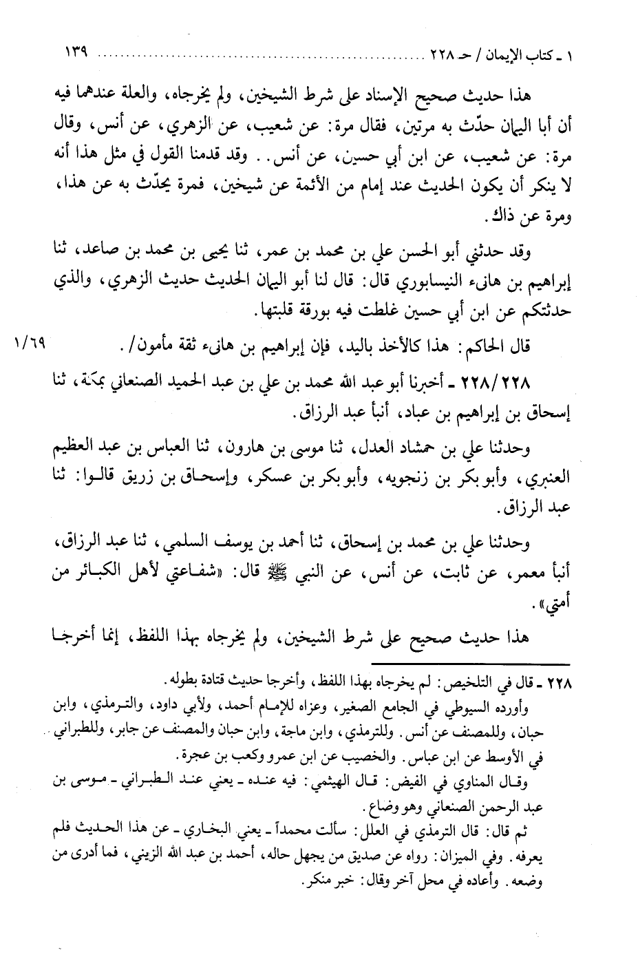 228 - أَخْبَرَنَا أَبُو عَبْدِ اللَّهِ مُحَمَّدُ بْنُ عَلِيِّ بْنِ عَبْدِ الْحَمِيدِ الصَّنْعَانِيُّ، بِمَكَّةَ، ثنا إِسْحَاقُ بْنُ إِبْرَاهِيمَ بْنِ عَبَّادٍ، أَنْبَأَ عَبْدُ الرَّزَّاقِ، وَحدثنا عَلِيُّ بْنُ حَمْشَاذَ الْعَدْلُ، ثنا مُوسَى بْنُ هَارُونَ، ثنا الْعَبَّاسُ بْنُ عَبْدِ الْعَظِيمِ الْعَنْبَرِيُّ، وَأَبُو بَكْرِ بْنُ زَنْجُوَيْهِ، وَأَبُو بَكْرِ بْنُ عَسْكَرٍ، وَإِسْحَاقُ بْنُ زُرَيْقٍ، قَالُوا: ثنا عَبْدُ الرَّزَّاقِ، وَحدثنا عَلِيُّ بْنُ مُحَمَّدِ بْنِ إِسْحَاقَ، ثنا أَحْمَدُ بْنُ يُوسُفَ السُّلَمِيُّ، ثنا عَبْدُ الرَّزَّاقِ، أَنْبَأَ مَعْمَرٌ، عَنْ ثَابِتٍ، عَنْ أَنَسٍ، عَنِ النَّبِيِّ صَلَّى اللهُ عَلَيْهِ وَسَلَّمَ، قَالَ: §«شَفَاعَتِي لِأَهْلِ الْكَبَائِرِ مِنْ أُمَّتِي» . «هَذَا حَدِيثٌ صَحِيحٌ عَلَى شَرْطِ الشَّيْخَيْنِ وَلَمْ يُخَرِّجَاهُ بِهَذَا اللَّفْظِ، إِنَّمَا أَخْرَجَا حَدِيثَ قَتَادَةَ، عَنْ أَنَسٍ بِطُولِهِ، وَمَنْ تَوَهَّمَ أَنَّ هَذِهِ لَفْظَةً مِنَ الْحَدِيثِ فَقَدْ وَهَمَ، فَإِنَّ هَذِهِ الشَّفَاعَةَ فِيهَا قَمْعُ الْمُبْتَدِعَةِ الْمُفَرِّقَةِ بَيْنَ الشَّفَاعَةِ لِأَهْلِ الصَّغَائِرِ وَالْكَبَائِرِ، وَلَهُ شَاهِدٌ بِهَذَا اللَّفْظِ عَنْ قَتَادَةَ وَأَشْعَثَ بْنِ جَابِرٍ الْحُدَّانِيِّ»