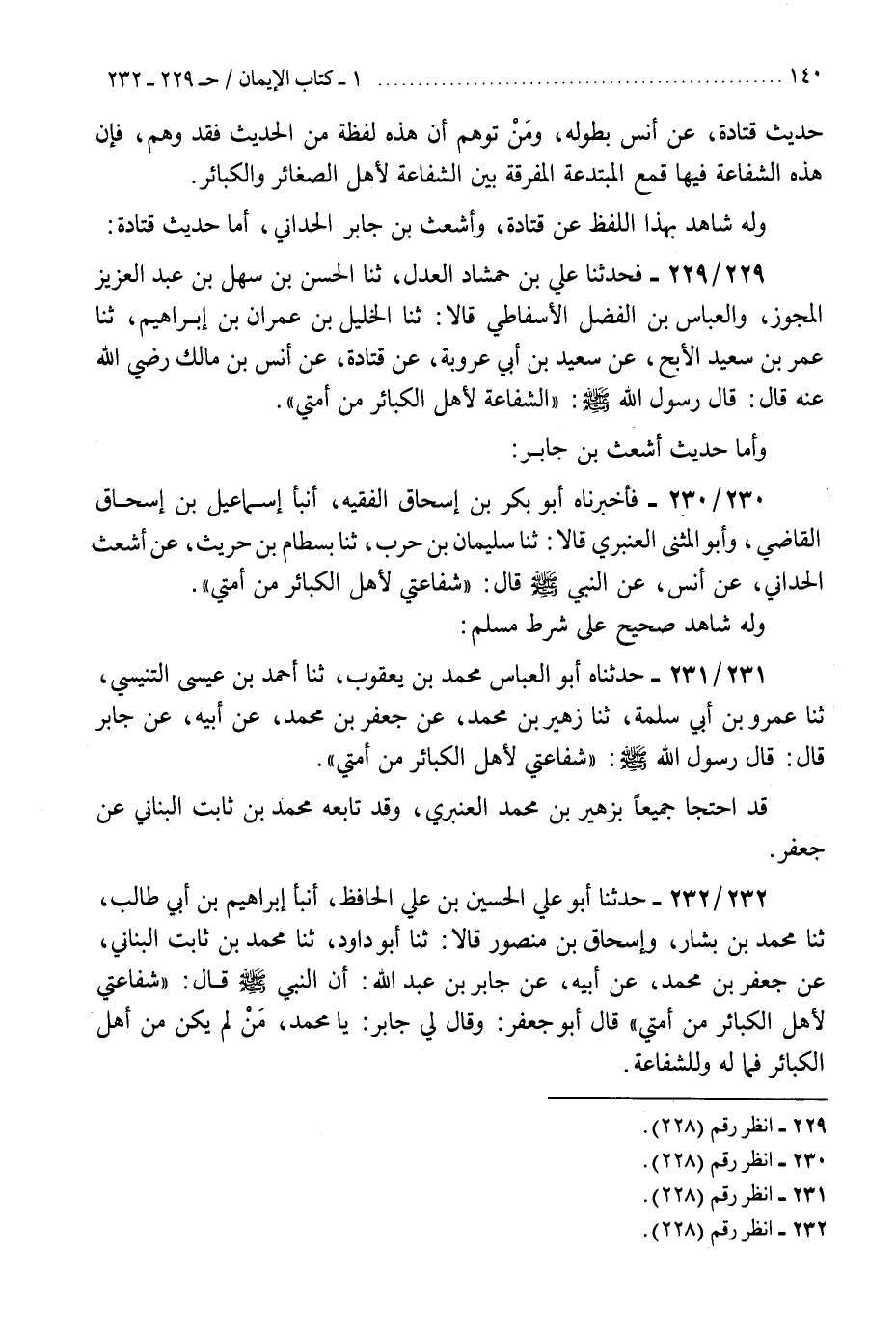 229 - فَحدثنا عَلِيُّ بْنُ حَمْشَاذَ الْعَدْلُ، ثنا الْحَسَنُ بْنُ سَهْلِ بْنِ عَبْدِ الْعَزِيزِ الْمُجَوَّزُ، وَالْعَبَّاسُ بْنُ الْفَضْلِ الْأَسْفَاطِيُّ، قَالَا: ثنا الْخَلِيلُ بْنُ عُمَرَ بْنِ إِبْرَاهِيمَ، ثنا عُمَرُ بْنُ سَعِيدٍ الْأَبَحُّ، عَنْ سَعِيدِ بْنِ أَبِي عَرُوبَةَ، عَنْ قَتَادَةَ، عَنْ أَنَسِ بْنِ مَالِكٍ رَضِيَ اللَّهُ عَنْهُ، قَالَ: قَالَ رَسُولُ اللَّهِ صَلَّى اللهُ عَلَيْهِ وَسَلَّمَ: §«الشَّفَاعَةُ لِأَهْلِ الْكَبَائِرِ مِنْ أُمَّتِي»