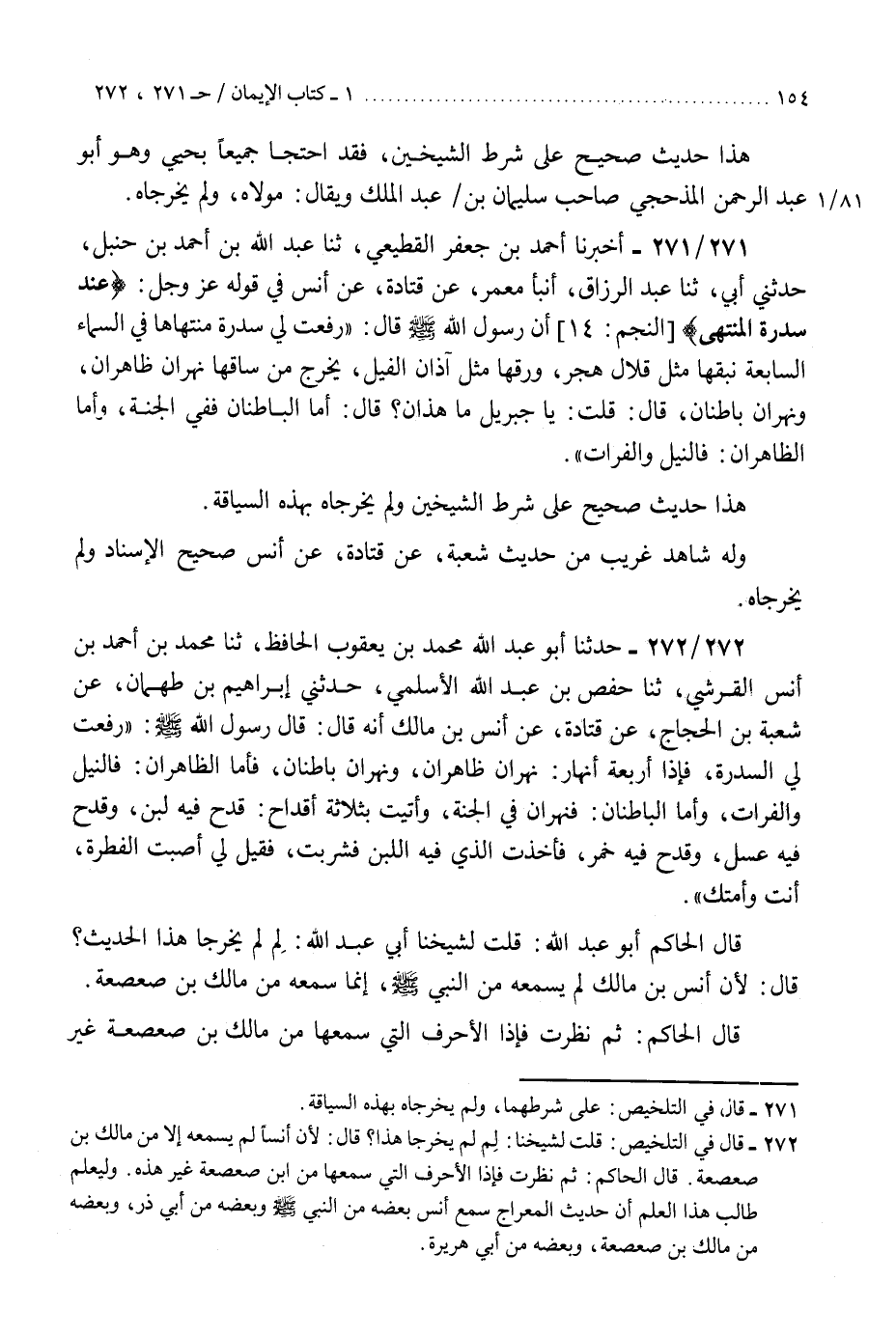272 - حَدَّثَنَا أَبُو عَبْدِ اللَّهِ مُحَمَّدُ بْنُ يَعْقُوبَ الْحَافِظُ، ثنا مُحَمَّدُ بْنُ أَحْمَدَ بْنِ أَنَسٍ الْقُرَشِيُّ، ثنا حَفْصُ بْنُ عَبْدِ اللَّهِ الْأَسْلَمِيُّ، حَدَّثَنِي إِبْرَاهِيمُ بْنُ طَهْمَانَ، عَنْ شُعْبَةَ بْنِ الْحَجَّاجِ، عَنْ قَتَادَةَ، عَنْ أَنَسِ بْنِ مَالِكٍ، أَنَّهُ قَالَ: قَالَ رَسُولُ اللَّهِ صَلَّى اللهُ عَلَيْهِ وَسَلَّمَ: " §رُفِعَتْ لِيَ السِّدْرَةُ فَإِذَا أَرْبَعَةُ أَنْهَارٍ: نَهْرَانِ ظَاهِرَانِ، وَنَهْرَانِ بَاطِنَانِ، فَأَمَّا الظَّاهِرَانِ فَالنِّيلُ وَالْفُرَاتُ، وَأَمَّا الْبَاطِنَانِ فَنَهَرَانِ فِي الْجَنَّةِ، وَأُتِيتُ بِثَلَاثَةِ أَقْدَاحٍ قَدَحٍ فِيهِ لَبَنٌ، وَقَدَحٍ فِيهِ عَسَلٌ، وَقَدَحٍ فِيهِ خَمْرٌ فَأَخَذْتُ الَّذِي فِيهِ اللَّبَنُ فَشَرِبْتُ فَقِيلَ لِي، أَصَبْتَ الْفِطْرَةَ أَنْتَ وَأُمَّتُكَ ". قَالَ الْحَاكِمُ أَبُو عَبْدِ اللَّهِ: " قُلْتُ لِشَيْخِنَا أَبِي عَبْدِ اللَّهِ لِمَ لَمْ يُخَرِّجَا هَذَا الْحَدِيثَ؟ قَالَ: لِأَنَّ أَنَسَ بْنَ مَالِكٍ لَمْ يَسْمَعْهُ مِنَ النَّبِيِّ صَلَّى اللهُ عَلَيْهِ وَسَلَّمَ إِنَّمَا سَمِعَهُ مِنْ مَالِكِ بْنِ صَعْصَعَةَ "، قَالَ الْحَاكِمُ: «ثُمَّ نَظَرْتُ فَإِذَا الْأَحْرُفُ الَّتِي سَمِعَهَا مِنْ مَالِكِ بْنِ صَعْصَعَةَ غَيْرُ هَذِهِ وَلِيَعْلَمْ طَالِبُ هَذَا الْعِلْمِ أَنَّ حَدِيثَ الْمِعْرَاجِ قَدْ سَمِعَ أَنَسٌ بَعْضَهُ مِنَ النَّبِيِّ صَلَّى اللهُ عَلَيْهِ وَسَلَّمَ وَبَعْضَهُ مِنْ أَبِي ذَرٍّ الْغِفَارِيِّ، وَبَعْضَهُ مِنْ مَالِكِ بْنِ صَعْصَعَةَ غَيْرُ هَذِهِ، وَبَعْضَهُ مِنْ أَبِي هُرَيْرَةَ»