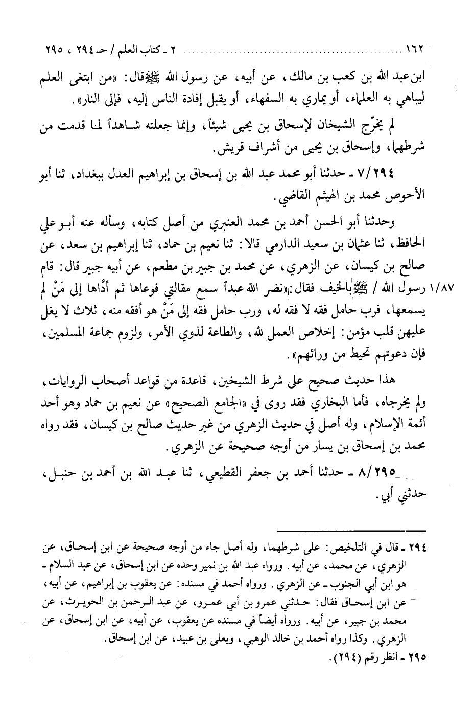 294 - حَدَّثَنَا أَبُو مُحَمَّدٍ عَبْدُ اللَّهِ بْنُ إِسْحَاقَ بْنِ إِبْرَاهِيمَ الْعَدْلُ، بِبَغْدَادَ، ثنا أَبُو الْأَحْوَصِ مُحَمَّدُ بْنُ الْهَيْثَمِ الْقَاضِي، وَحدثنا أَبُو الْحَسَنِ أَحْمَدُ بْنُ مُحَمَّدٍ الْعَنْبَرِيُّ مِنْ أَصْلِ كِتَابِهِ، وَسَأَلَهُ عَنْهُ أَبُو عَلِيٍّ الْحَافِظُ، ثنا عُثْمَانُ بْنُ سَعِيدٍ الدَّارِمِيُّ، قَالَا: ثنا نُعَيْمُ بْنُ حَمَّادٍ، ثنا إِبْرَاهِيمُ بْنُ سَعْدٍ، عَنْ صَالِحِ بْنِ كَيْسَانَ، عَنِ الزُّهْرِيِّ، عَنْ مُحَمَّدِ بْنِ جُبَيْرِ بْنِ مُطْعِمٍ، عَنْ أَبِيهِ جُبَيْرٍ، قَالَ: قَامَ رَسُولُ اللَّهِ صَلَّى اللهُ عَلَيْهِ وَسَلَّمَ بِالْخَيْفِ، فَقَالَ: " §نَضَّرَ اللَّهُ عَبْدًا سَمِعَ مَقَالَتِي فَوَعَاهَا، ثُمَّ أَدَّاهَا إِلَى مَنْ لَمْ يَسْمَعْهَا، فَرُبَّ حَامِلِ فِقْهٍ لَا فِقْهَ لَهُ، وَرَبَّ حَامِلِ فِقْهٍ إِلَى مَنْ هُوَ أَفْقَهُ مِنْهُ، ثَلَاثٌ لَا يُغِلُّ عَلَيْهِنَّ قَلْبُ مُؤْمِنٍ: إِخْلَاصُ الْعَمَلِ لِلَّهِ، وَالطَّاعَةُ لِذَوِي الْأَمْرِ، وَلُزُومُ جَمَاعَةِ الْمُسْلِمِينَ، فَإِنَّ دَعْوَتَهُمْ تُحِيطُ مِنْ وَرَائِهِمْ «.» هَذَا حَدِيثٌ صَحِيحٌ عَلَى شَرْطِ الشَّيْخَيْنِ. قَاعِدَةٌ مِنْ قَوَاعِدِ أَصْحَابِ الرِّوَايَاتِ، وَلَمْ يُخَرِّجَاهُ، فَأَمَّا الْبُخَارِيُّ فَقَدْ رَوَى فِي الْجَامِعِ الصَّحِيحِ، عَنْ نُعَيْمِ بْنِ حَمَّادٍ وَهُوَأَحَدُ أَئِمَّةِ الْإِسْلَامِ وَلَهُ أَصْلٌ مِنْ حَدِيثِ الزُّهْرِيِّ مِنْ غَيْرِ حَدِيثِ صَالِحِ بْنِ كَيْسَانَ فَقَدْ رَوَاهُ مُحَمَّدُ بْنُ إِسْحَاقَ بْنِ يَسَارٍ مِنْ أَوْجُهٍ صَحِيحَةٍ، عَنِ الزُّهْرِيِّ"K294 - على شرطهما