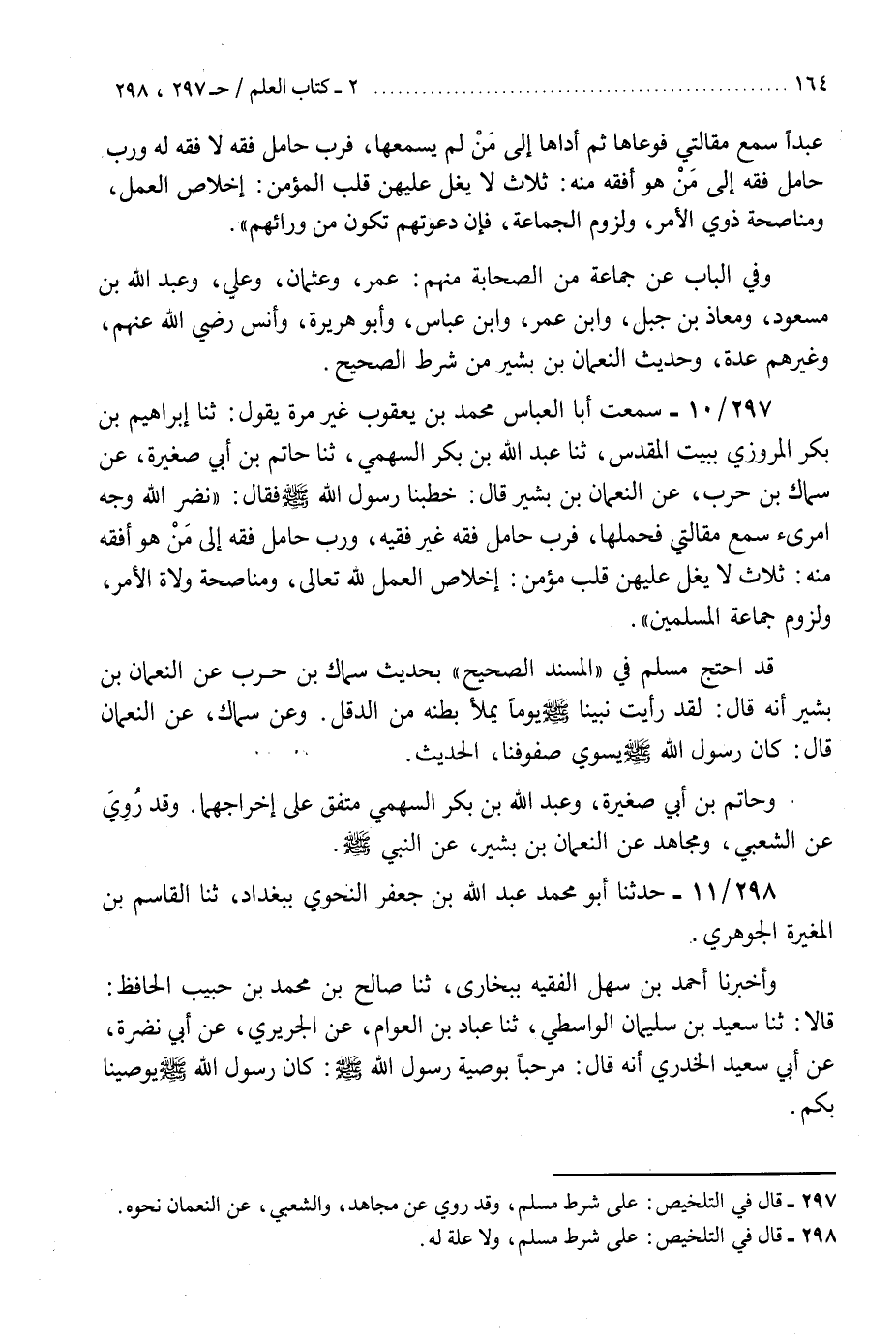 297 - سَمِعْتُ أَبَا الْعَبَّاسِ مُحَمَّدَ بْنَ يَعْقُوبَ غَيْرُ مَرَّةٍ، يَقُولُ: ثنا إِبْرَاهِيمُ بْنُ بَكْرٍ الْمَرْوَزِيُّ، بِبَيْتِ الْمَقْدِسِ، ثنا عَبْدُ اللَّهِ بْنُ بَكْرٍ السَّهْمِيُّ، ثنا حَاتِمُ بْنُ أَبِي صَغِيرَةَ، عَنْ سِمَاكِ بْنِ حَرْبٍ، عَنِ النُّعْمَانِ بْنِ بَشِيرٍ، قَالَ: خَطَبَنَا رَسُولُ اللَّهِ صَلَّى اللهُ عَلَيْهِ وَسَلَّمَ، فَقَالَ: " §نَضَّرَ اللَّهُ وَجْهَ امْرِئٍ سَمِعَ مَقَالَتِي فَحَمَلَهَا، فَرُبَّ حَامِلِ فِقْهٍ غَيْرُ فَقِيهٍ، وَرُبَّ حَامِلِ فِقْهٍ إِلَى مَنْ هُوَ أَفْقَهُ مِنْهُ ثَلَاثٌ لَا يُغِلُّ عَلَيْهِنَّ قَلْبُ مُؤْمِنٍ: إِخْلَاصُ الْعَمَلِ لِلَّهِ تَعَالَى، وَمُنَاصَحَةُ وُلَاةِ الْأَمْرِ، وَلُزُومُ جَمَاعَةِ الْمُسْلِمِينَ «.» قَدِ احْتَجَّ مُسْلِمٌ فِي الْمُسْنَدِ الصَّحِيحِ بِحَدِيثِ سِمَاكِ بْنِ حَرْبٍ، عَنِ النُّعْمَانِ بْنِ بَشِيرٍ أَنَّهُ قَالَ: لَقَدْ رَأَيْتُ نَبِيَّنَا صَلَّى اللهُ عَلَيْهِ وَسَلَّمَ يَوْمًا يَمْلَأُ بَطْنَهُ مِنَ الدَّقَلِ ". وَعَنْ سِمَاكٍ، عَنِ النُّعْمَانِ، قَالَ: كَانَ رَسُولُ اللَّهِ صَلَّى اللهُ عَلَيْهِ وَسَلَّمَ يُسَوِّي صُفُوفَنَا، الْحَدِيثَ. «وَحَاتِمُ بْنُ أَبِي صَغِيرَةَ وَعَبْدُ اللَّهِ بْنُ بَكْرٍ السَّهْمِي مُتَّفَقٌ عَلَى إِخْرَاجِهِمَا» . وَقَدْ رُوِيَ، عَنِ الشَّعْبِيِّ، وَمُجَاهِدٍ، عَنِ النُّعْمَانِ بْنِ بَشِيرٍ، عَنِ النَّبِيِّ صَلَّى اللهُ عَلَيْهِ وَسَلَّمَK297 - على شرط مسلم