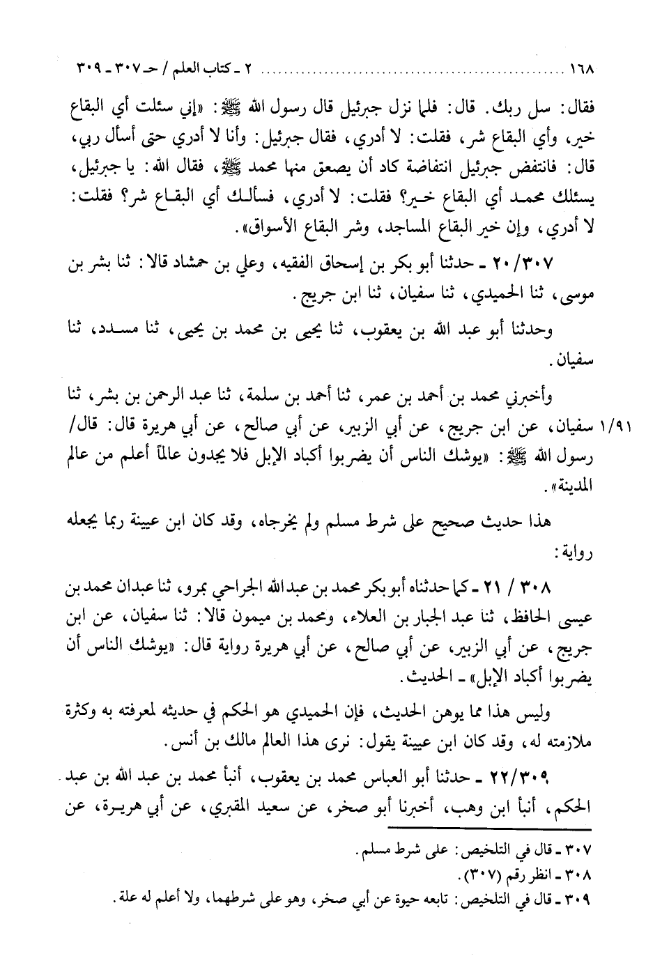 307 - حَدَّثَنَا أَبُو بَكْرِ بْنُ إِسْحَاقَ الْفَقِيهُ، وَعَلِيُّ بْنُ حَمْشَاذَ، قَالَا: ثنا بِشْرُ بْنُ مُوسَى، ثنا الْحُمَيْدِيُّ، ثنا سُفْيَانُ، ثنا ابْنُ جُرَيْجٍ، وَحدثنا أَبُو عَبْدِ اللَّهِ بْنُ يَعْقُوبَ، ثنا يَحْيَى بْنُ مُحَمَّدِ بْنِ يَحْيَى، ثنا مُسَدَّدٌ، ثنا سُفْيَانُ، وَأَخْبَرَنِي مُحَمَّدُ بْنُ أَحْمَدَ بْنِ عُمَرَ، ثنا أَحْمَدُ بْنُ سَلَمَةَ، ثنا عَبْدُ الرَّحْمَنِ بْنُ بِشْرٍ، ثنا سُفْيَانُ، عَنِ ابْنِ جُرَيْجٍ، عَنْ أَبِي الزُّبَيْرِ، عَنْ أَبِي صَالِحٍ، عَنْ أَبِي هُرَيْرَةَ، قَالَ: قَالَ رَسُولُ اللَّهِ صَلَّى اللهُ عَلَيْهِ وَسَلَّمَ: §«يُوشِكُ النَّاسُ أَنْ يَضْرِبُوا أَكْبَادَ الْإِبِلِ فَلَا يَجِدُونَ عَالِمًا أَعْلَمَ مِنْ عَالِمِ الْمَدِينَةِ» . «هَذَا حَدِيثٌ صَحِيحٌ عَلَى شَرْطِ مُسْلِمٍ، وَلَمْ يُخَرِّجَاهُ، وَقَدْ كَانَ ابْنُ عُيَيْنَةَ رُبَّمَا يَجْعَلُهُ رِوَايَةً» K307 - على شرط مسلم