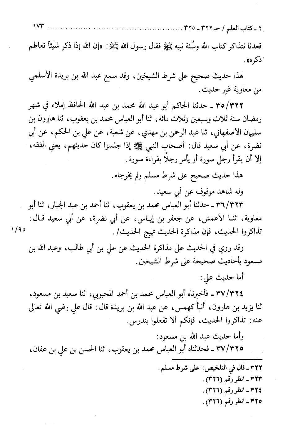 323 - حَدَّثَنَا أَبُو الْعَبَّاسِ مُحَمَّدُ بْنُ يَعْقُوبَ، ثنا أَحْمَدُ بْنُ عَبْدِ الْجَبَّارِ، ثنا أَبُو مُعَاوِيَةَ، ثنا الْأَعْمَشُ، عَنْ جَعْفَرِ بْنِ إِيَاسٍ، عَنْ أَبِي نَضْرَةَ، عَنْ أَبِي سَعِيدٍ، قَالَ: «§تَذَاكَرُوا الْحَدِيثَ، فَإِنَّ مُذَاكَرَةَ الْحَدِيثِ تُهَيِّجُ الْحَدِيثَ» . «وَقَدْ رُوِيَ فِي الْحَدِيثِ عَلَى مُذَاكَرَةِ الْحَدِيثِ عَنْ عَلِيِّ بْنِ أَبِي طَالِبٍ، وَعَبْدِ اللَّهِ بْنِ مَسْعُودٍ، بِأَحَادِيثَ صَحِيحَةٍ عَلَى شَرْطِ الشَّيْخَيْنِ»