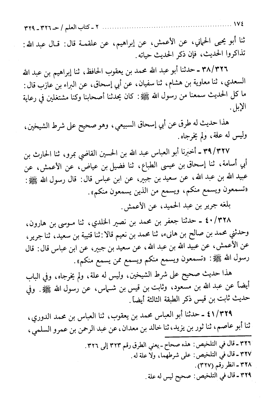 326 - حَدَّثَنَا أَبُو عَبْدِ اللَّهِ مُحَمَّدُ بْنُ يَعْقُوبَ الْحَافِظُ، ثنا إِبْرَاهِيمُ بْنُ عَبْدِ اللَّهِ السَّعْدِيُّ، ثنا مُعَاوِيَةُ بْنُ هِشَامٍ، ثنا سُفْيَانُ، عَنْ أَبِي إِسْحَاقَ، عَنِ الْبَرَاءِ بْنِ عَازِبٍ، قَالَ: §«مَا كُلُّ الْحَدِيثٍ سَمِعْنَا مِنْ رَسُولِ اللَّهِ صَلَّى اللهُ عَلَيْهِ وَسَلَّمَ كَانَ يُحَدِّثُنَا أَصْحَابُنَا وَكُنَّا مُشْتَغِلِينَ فِي رِعَايَةِ الْإِبِلِ» . «هَذَا حَدِيثٌ لَهُ طُرُقٌ عَنْ أَبِي إِسْحَاقَ السَّبِيعِيِّ، وَهُوَ صَحِيحٌ عَلَى شَرْطِ الشَّيْخَيْنِ، وَلَيْسَ لَهُ عِلَّةٌ وَلَمْ يُخَرِّجَاهُ» K326 - صحيح