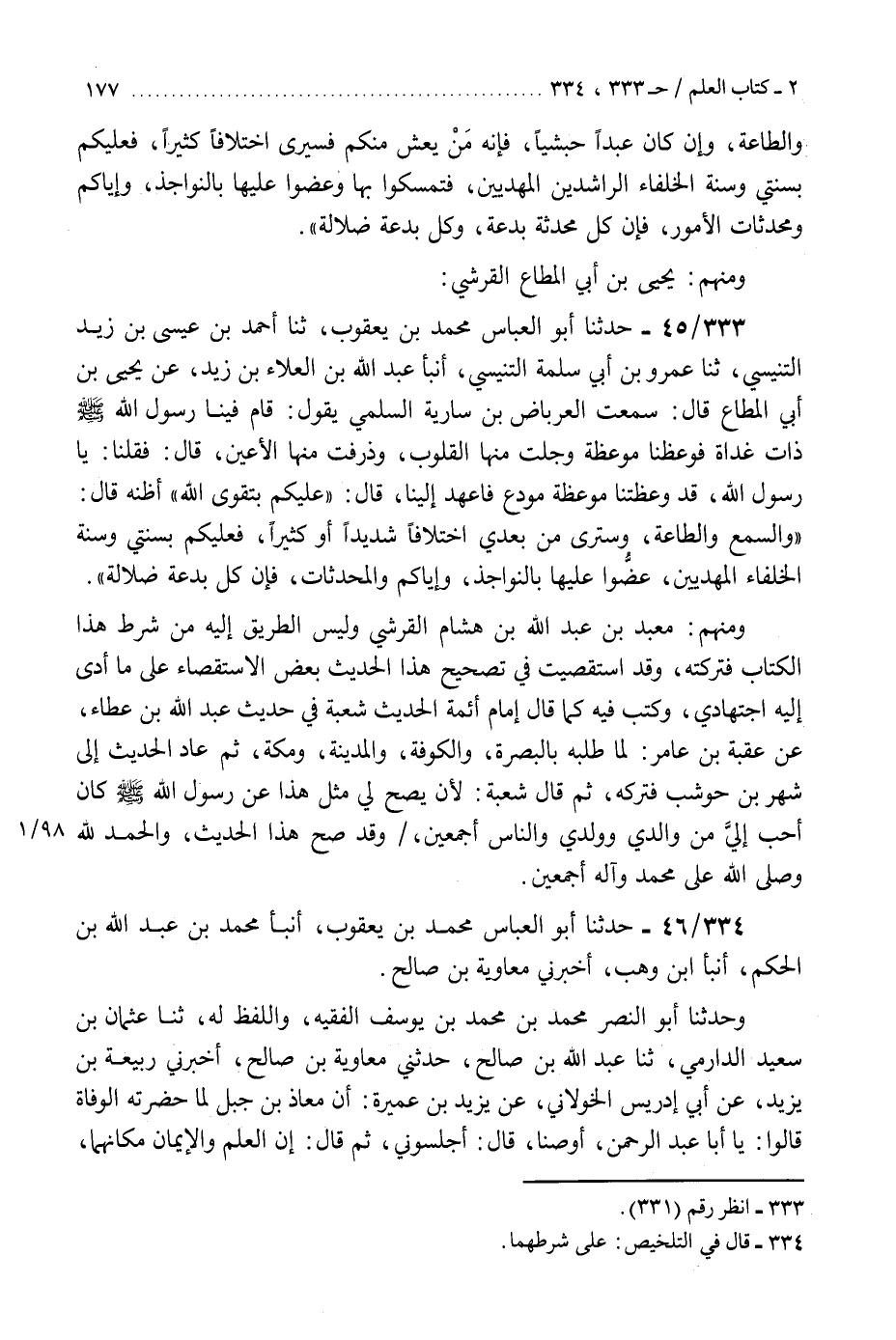 333 - حَدَّثَنَا أَبُو الْعَبَّاسِ مُحَمَّدُ بْنُ يَعْقُوبَ، ثنا أَحْمَدُ بْنُ عِيسَى بْنِ زَيْدٍ التِّنِّيسِيُّ، ثنا عَمْرُو بْنُ أَبِي سَلَمَةَ التِّنِّيسِيُّ، أَنْبَأَ عَبْدُ اللَّهِ بْنُ الْعَلَاءِ بْنِ زَبْرٍ، عَنْ يَحْيَى بْنِ أَبِي الْمُطَاعِ، قَالَ: سَمِعْتُ الْعِرْبَاضَ بْنَ سَارِيَةَ السُّلَمِيَّ، يَقُولُ: قَامَ فِينَا رَسُولُ اللَّهِ صَلَّى اللهُ عَلَيْهِ وَسَلَّمَ ذَاتَ غَدَاةٍ فَوَعَظَنَا مَوْعِظَةً، وَجِلَتْ مِنْهَا الْقُلُوبُ، وَذَرَفَتْ مِنْهَا الْأَعْيُنُ، قَالَ: فَقُلْنَا: يَا رَسُولَ اللَّهِ قَدْ وَعَظْتَنَا مَوْعِظَةَ مُوَدَّعٍ فَاعْهَدْ إِلَيْنَا، قَالَ: " §عَلَيْكُمْ بِتَقْوَى اللَّهِ - أَظُنُّهُ قَالَ: وَالسَّمْعِ وَالطَّاعَةِ -، وَسَتَرَى مِنْ بَعْدِي اخْتِلَافًا شَدِيدًا - أَوْ كَثِيرًا - فَعَلَيْكُمْ بِسُنَّتِي وَسُنَّةِ الْخُلَفَاءِ الْمَهْدِيِّينَ، عَضُّوا عَلَيْهَا بِالنَّوَاجِذِ، وَإِيَّاكُمْ وَالْمُحْدَثَاتِ فَإِنَّ كُلَّ بِدْعَةٍ ضَلَالَةٌ «.» وَمِنْهُمْ مَعْبَدُ بْنُ عَبْدِ اللَّهِ بْنِ هِشَامٍ الْقُرَشِيُّ وَلَيْسَ الطَّرِيقُ إِلَيْهِ مِنْ شَرْطِ هَذَا الْكِتَابِ فَتَرَكْتُهُ وَقَدِ اسْتَقْصَيْتُ فِي تَصْحِيحِ هَذَا الْحَدِيثِ بَعْضَ الِاسْتِقْصَاءِ عَلَى مَا أَدَّى إِلَيْهِ اجْتِهَادِي وَكُتِبَ فِيهِ، كَمَا قَالَ إِمَامُ أَئِمَّةِ الْحَدِيثِ شُعْبَةُ فِي حَدِيثِ عَبْدِ اللَّهِ بْنِ عَطَاءٍ، عَنْ عُقْبَةَ بْنِ عَامِرٍ لَمَّا طَلَبَهُ بِالْبَصْرَةِ وَالْكُوفَةِ وَالْمَدِينَةِ وَمَكَّةَ، ثُمَّ عَادَ الْحَدِيثُ إِلَى شَهْرِ بْنِ حَوْشَبٍ فَتَرَكَهُ، ثُمَّ قَالَ شُعْبَةُ: لَأَنْ يَصِحَّ لِي مِثْلُ هَذَا عَنْ رَسُولِ اللَّهِ صَلَّى اللهُ عَلَيْهِ وَسَلَّمَ كَانَ أَحَبَّ إِلَيَّ مِنْ وَالِدِي وَوَلَدِي وَالنَّاسِ أَجْمَعِينَ، وَقَدْ صَحَّ هَذَا الْحَدِيثُ وَالْحَمْدُ لِلَّهِ وَصَلَّى اللَّهُ عَلَى مُحَمَّدٍ وَآلِهِ أَجْمَعِينَ "