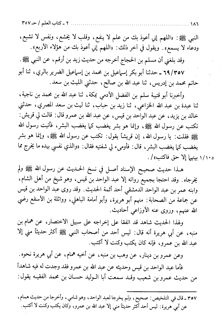 357 - حَدَّثَنَا أَبُو بَكْرٍ إِسْمَاعِيلُ بْنُ مُحَمَّدِ بْنِ إِسْمَاعِيلَ الضَّرِيرِ بِالرِّيِّ، ثنا أَبُو حَاتِمٍ مُحَمَّدُ بْنُ إِدْرِيسَ، ثنا عَبْدُ اللَّهِ بْنُ صَالِحٍ، حَدَّثَنِي اللَّيْثُ بْنُ سَعْدٍ، وَأَخْبَرَنَا أَبُو قُتَيْبَةَ سَلْمُ بْنُ فَضْلٍ الْآدَمِيُّ، بِمَكَّةَ، ثنا عَبْدُ اللَّهِ بْنُ مُحَمَّدِ بْنِ نَاجِيَةَ، ثنا عَبْدَةُ بْنُ عَبْدِ اللَّهِ الْخُزَاعِيُّ، ثنا زَيْدُ بْنُ حُبَابٍ، ثنا لَيْثُ بْنُ سَعْدٍ الْمِصْرِيُّ، حَدَّثَنِي خَالِدُ بْنُ يَزِيدَ، عَنْ عَبْدِ الْوَاحِدِ بْنِ قَيْسٍ، عَنْ عَبْدِ اللَّهِ بْنِ عَمْرٍو، قَالَ: قَالَتْ لِي قُرَيْشٌ: تَكْتُبُ عَنْ رَسُولِ اللَّهِ صَلَّى اللهُ عَلَيْهِ وَسَلَّمَ وَإِنَّمَا هُوَ بَشَرٌ يَغْضَبُ كَمَا يَغْضَبُ الْبَشَرُ، فَأَتَيْتُ رَسُولَ اللَّهِ صَلَّى اللهُ عَلَيْهِ وَسَلَّمَ فَقُلْتُ: يَا رَسُولَ اللَّهِ إِنَّ قُرَيْشًا، تَقُولُ: تَكْتُبُ عَنْ رَسُولِ اللَّهِ صَلَّى اللهُ عَلَيْهِ وَسَلَّمَ وَإِنَّمَا هُوَ بَشَرٌ يَغْضَبُ كَمَا يَغْضَبُ الْبَشَرُ، قَالَ: فَأَوْمَأَ إِلَى شَفَتَيْهِ، فَقَالَ: §«وَالَّذِي نَفْسِي بِيَدِهِ مَا يَخْرُجُ مِمَّا بَيْنَهُمَا إِلَّا حَقٌّ فَاكْتُبْ» . «هَذَا حَدِيثٌ صَحِيحُ الْإِسْنَادِ أَصْلٌ فِي نَسْخِ الْحَدِيثِ، عَنْ رَسُولِ اللَّهِ صَلَّى اللهُ عَلَيْهِ وَسَلَّمَ وَلَمْ يُخَرِّجَاهُ، وَقَدِ احْتَجَّا بِجَمِيعِ رُوَاتِهِ إِلَّا عَبْدُ الْوَاحِدِ بْنُ قَيْسٍ وَهُوَ شَيْخٌ مِنْ أَهْلِ الشَّامِ، وَابْنُهُ عُمَرُ بْنُ عَبْدِ الْوَاحِدِ الدِّمَشْقِيُّ أَحَدُ أَئِمَّةِ الْحَدِيثِ» . وَقَدْ رَوَى عَبْدُ الْوَاحِدِ بْنُ قَيْسٍ، عَنْ جَمَاعَةٍ مِنَ الصَّحَابَةِ مِنْهُمْ أَبُو هُرَيْرَةَ، وَأَبُو أُمَامَةَ الْبَاهِلِيُّ، وَوَاثِلَةُ بْنُ الْأَسْقَعِ رَضِيَ اللَّهُ عَنْهُمْ. وَرَوَى عَنْهُ الْأَوْزَاعِيُّ أَحَادِيثَ. «وَلِهَذَا الْحَدِيثِ شَاهِدٌ قَدِ اتَّفَقَا عَلَى إِخْرَاجِهِ عَلَى سَبِيلِ الِاخْتِصَارِ» . عَنْ هَمَّامِ بْنِ مُنَبِّهٍ، عَنْ أَبِي هُرَيْرَةَ أَنَّهُ قَالَ: لَيْسَ أَحَدٌ مِنْ أَصْحَابِ النَّبِيِّ صَلَّى اللهُ عَلَيْهِ وَسَلَّمَ أَكْثَرَ حَدِيثًا مِنِّي إِلَّا عَبْدُ اللَّهِ بْنُ عَمْرٍو، فَإِنَّهُ كَانَ يَكْتُبُ وَكُنْتُ لَا أَكْتُبُ. وَعَنْ عَمْرِو بْنِ دِينَارٍ، عَنْ وَهْبِ بْنِ مُنَبِّهٍ، عَنْ أَخِيهِ هَمَّامٍ، عَنْ أَبِي هُرَيْرَةَ نَحْوَهُ. «فَأَمَّا عَبْدُ الْوَاحِدِ بْنُ قَيْسٍ، وَحَدِيثُهُ عَنْ عَبْدِ اللَّهِ بْنِ عَمْرٍو، فَقَدْ وَجَدْتُ لَهُ فِيهِ شَاهِدًا مِنْ حَدِيثِ عَمْرِو بْنِ شُعَيْبٍ» . وَقَدْ سَمِعْتُ أَبَا الْوَلِيدِ حَسَّانَ بْنَ مُحَمَّدٍ الْفَقِيهَ، يَقُولُ: سَمِعْتُ الْحَسَنَ بْنَ سُفْيَانَ، يَقُولُ: سَمِعْتُ إِسْحَاقَ بْنَ إِبْرَاهِيمَ الْحَنْظَلِيَّ، يَقُولُ: إِذَا كَانَ الرَّاوِي عَنْ عَمْرِو بْنِ شُعَيْبٍ ثِقَةً، فَهُوَ كَأَيُّوبَ، عَنْ نَافِعٍ، عَنِ ابْنِ عُمَرَ، فَأَمَّا حَدِيثُ الشَّاهِدِK357 - صحيح
