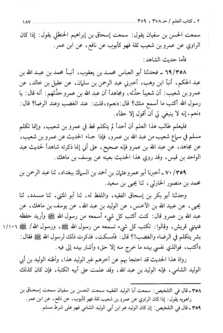 359 - أَخْبَرَنَا أَبُو عَمْرٍو عُثْمَانُ بْنُ أَحْمَدَ بْنِ السَّمَّاكِ، بِبَغْدَادَ، ثنا عَبْدُ الرَّحْمَنِ بْنُ مُحَمَّدُ بْنِ مَنْصُورٍ الْحَارِثِيُّ، ثنا يَحْيَى بْنُ سَعِيدٍ، وَحدثنا أَبُو بَكْرِ بْنُ إِسْحَاقَ الْفَقِيهُ، وَاللَّفْظُ لَهُ، ثنا أَبُو الْمُثَنَّى، ثنا مُسَدَّدٌ، ثنا يَحْيَى، عَنْ عُبَيْدِ اللَّهِ بْنِ الْأَخْنَسِ، عَنِ الْوَلِيدِ بْنِ عَبْدِ اللَّهِ، عَنْ يُوسُفَ بْنِ مَاهَكَ، عَنْ عَبْدِ اللَّهِ بْنِ عَمْرٍو، قَالَ: كُنْتُ أَكْتُبُ كُلَّ شَيْءٍ أَسْمَعُهُ مِنْ رَسُولِ اللَّهِ صَلَّى اللهُ عَلَيْهِ وَسَلَّمَ وَأُرِيدُ حِفْظَهُ فَنَهَتْنِي قُرَيْشٌ، وَقَالُوا: تُكْتَبُ كُلَّ شَيْءٍ تَسْمَعْهُ مِنْ رَسُولِ اللَّهِ صَلَّى اللهُ عَلَيْهِ وَسَلَّمَ، وَرَسُولُ اللَّهِ صَلَّى اللهُ عَلَيْهِ وَسَلَّمَ بَشَرٌ يَتَكَلَّمُ فِي الرِّضَاءِ وَالْغَضَبِ؟، قَالَ: فَأَمْسَكْتُ، فَذَكَرْتُ ذَلِكَ لِرَسُولِ اللَّهِ صَلَّى اللهُ عَلَيْهِ وَسَلَّمَ، فَقَالَ: §«اكْتُبْ فَوَالَّذِي نَفْسِي بِيَدِهِ مَا خَرَجَ مِنْهُ إِلَّا حَقٌّ» وَأَشَارَ بِيَدِهِ إِلَى فِيهِ. " رُوَاةُ هَذَا الْحَدِيثِ قَدِ احْتَجَّا بِهِمْ، عَنْ آخِرِهِمْ غَيْرِ الْوَلِيدِ هَذَا، وَأَظُنُّهُ الْوَلِيدُ بْنُ أَبِي الْوَلِيدِ الشَّامِيُّ، فَإِنَّهُ الْوَلِيدُ بْنُ عَبْدِ اللَّهِ، وَقَدْ عُلِمَتْ عَلَى أَبِيهِ الْكَتَبَةُ، فَإِنْ كَانَ كَذَلِكَ فَقَدِ احْتَجَّ مُسْلِمٌ بِهِ، وَقَدْ صَحَّتِ الرِّوَايَةُ عَنْ أَمِيرِ الْمُؤْمِنِينَ عُمَرَ بْنِ الْخَطَّابِ أَنَّهُ قَالَ: قَيِّدُوا الْعِلْمَ بِالْكِتَابِ "K359 - إن كان الوليد هو ابن أبي الوليد الشامي فهو على شرط مسلم