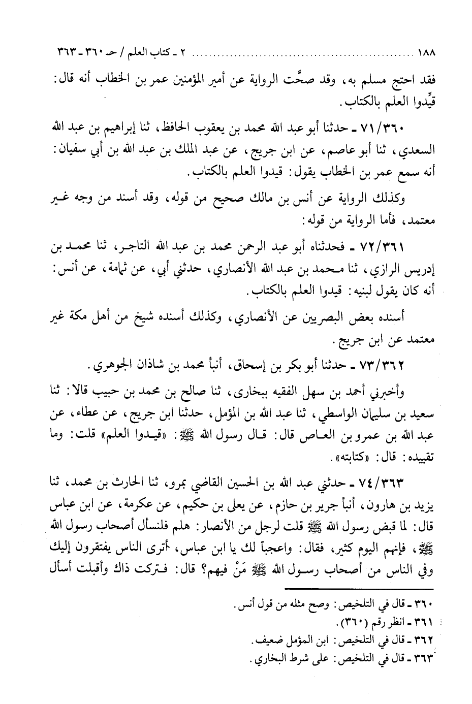360 - حَدَّثَنَا أَبُو عَبْدِ اللَّهِ مُحَمَّدُ بْنُ يَعْقُوبَ الْحَافِظُ، ثنا إِبْرَاهِيمُ بْنُ عَبْدِ اللَّهِ السَّعْدِيُّ، ثنا أَبُو عَاصِمٍ، عَنِ ابْنِ جُرَيْجٍ، عَنْ عَبْدِ الْمَلِكِ بْنِ عَبْدِ اللَّهِ بْنِ أَبِي سُفْيَانَ، أَنَّهُ سَمِعَ عُمَرَ بْنَ الْخَطَّابِ، يَقُولُ: §«قَيِّدُوا الْعِلْمَ بِالْكِتَابِ» . «وَكَذَلِكَ الرِّوَايَةُ عَنْ أَنَسِ بْنِ مَالِكٍ صَحِيحٌ مِنْ قَوْلِهِ، وَقَدْ أُسْنِدَ مِنْ وَجْهٍ غَيْرِ مُعْتَمَدٍ، فَأَمَّا الرِّوَايَةُ مِنْ قَوْلِهِ» K360 - وصح مثله من قول أنس