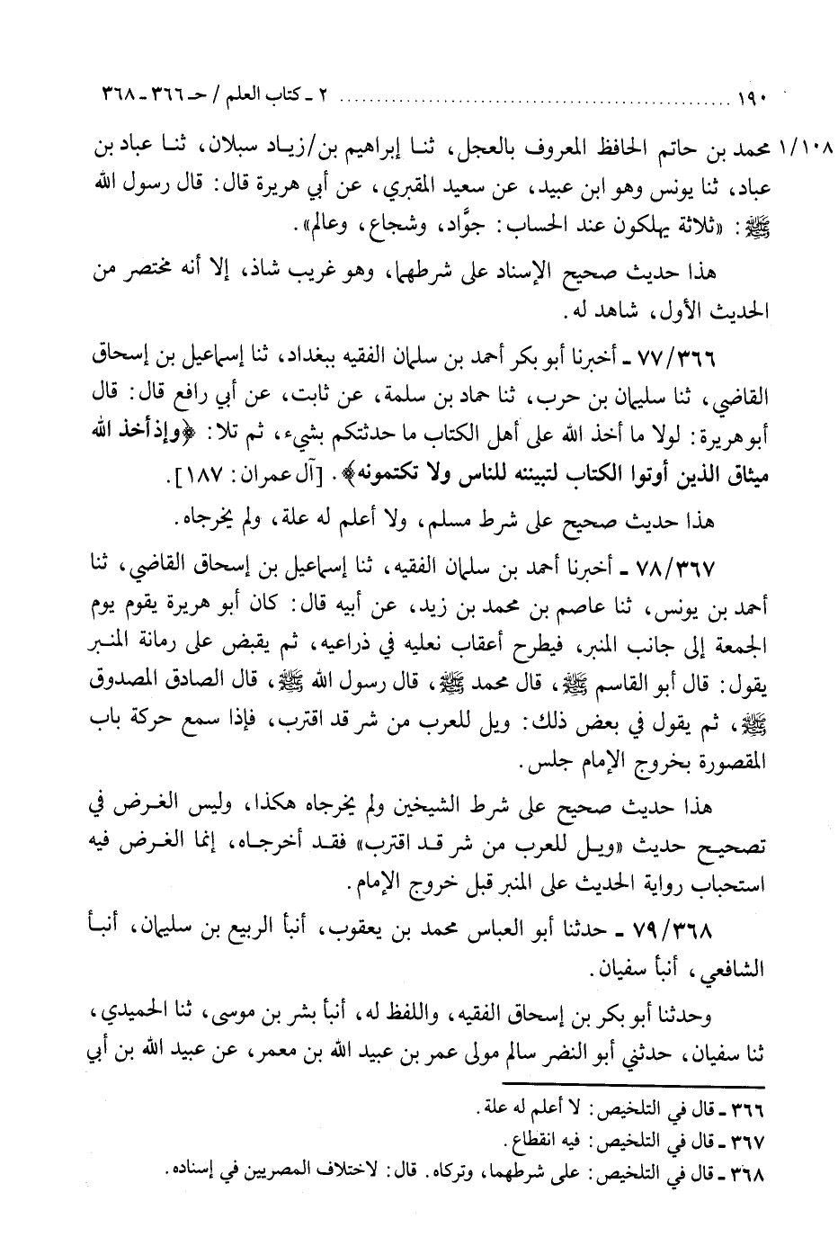 366 - أَخْبَرَنَا أَبُو بَكْرٍ أَحْمَدُ بْنُ سَلْمَانَ الْفَقِيهُ، بِبَغْدَادَ، ثنا إِسْمَاعِيلُ بْنُ إِسْحَاقَ الْقَاضِي، ثنا سُلَيْمَانُ بْنُ حَرْبٍ، ثنا حَمَّادُ بْنُ سَلَمَةَ، عَنْ ثَابِتٍ، عَنْ أَبِي رَافِعٍ، قَالَ: قَالَ أَبُو هُرَيْرَةَ: §" لَوْلَا مَا أَخَذَ اللَّهُ عَلَى أَهْلِ الْكِتَابِ مَا حَدَّثْتُكُمْ بِشَيْءٍ، ثُمَّ تَلَا {وَإِذْ أَخَذَ اللَّهُ مِيثَاقَ الَّذِينَ أُوتُوا الْكِتَابَ لَتُبَيِّنُنَّهُ لِلنَّاسِ وَلَا تَكْتُمُونَهُ} [آل عمران: 187] «.» هَذَا حَدِيثٌ صَحِيحٌ عَلَى شَرْطِ مُسْلِمٍ، وَلَا أَعْلَمُ لَهُ عِلَّةً وَلَمْ يُخَرِّجَاهُ "K366 - لا أعلم له علة