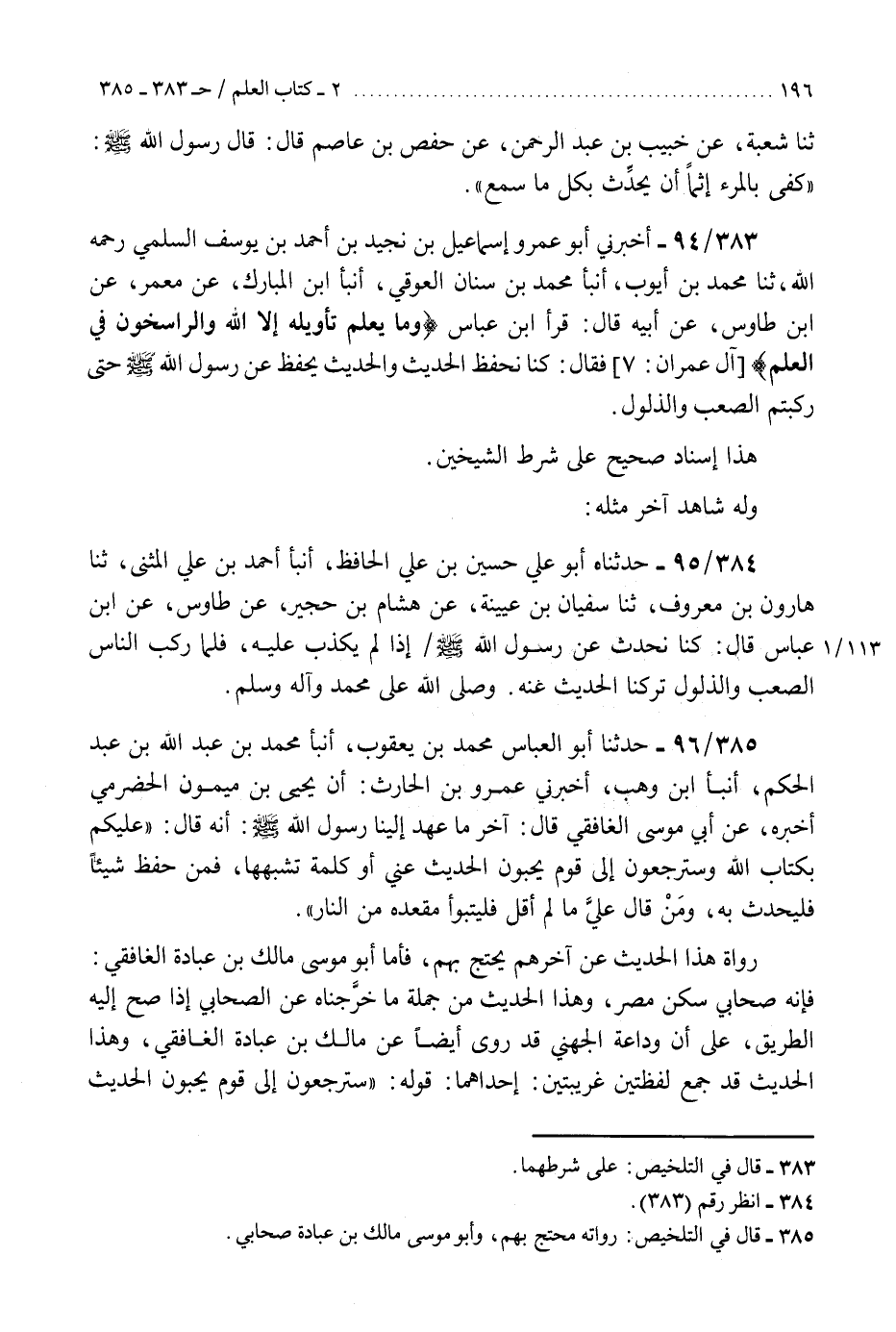 383 - أَخْبَرَنِي أَبُو عَمْرٍو إِسْمَاعِيلُ بْنُ نُجَيْدِ بْنِ أَحْمَدَ بْنِ يُوسُفَ السُّلَمِيُّ رَحِمَهُ اللَّهُ، ثنا مُحَمَّدُ بْنُ أَيُّوبَ، أَنْبَأَ مُحَمَّدُ بْنُ سِنَانٍ الْعَوَقِيُّ، أَنْبَأَ ابْنُ الْمُبَارَكِ، عَنْ مَعْمَرٍ، عَنِ ابْنِ طَاوُسٍ، عَنْ أَبِيهِ، قَالَ: قَرَأَ ابْنُ عَبَّاسٍ {§وَمَا يَعْلَمُ تَأْوِيلَهُ إِلَّا اللَّهُ وَالرَّاسِخُونَ فِي الْعِلْمِ} [آل عمران: 7] فَقَالَ: «كُنَّا نَحْفَظُ الْحَدِيثَ وَالْحَدِيثُ يُحْفَظُ عَنْ رَسُولِ اللَّهِ صَلَّى اللهُ عَلَيْهِ وَسَلَّمَ حَتَّى رَكِبْتُمُ الصَّعْبَ وَالذَّلُولَ» . «هَذَا إِسْنَادٌ صَحِيحٌ عَلَى شَرْطِ الشَّيْخَيْنِ، وَلَهُ شَاهِدٌ آخَرُ مِثْلُهُ» K383 - على شرطهما
