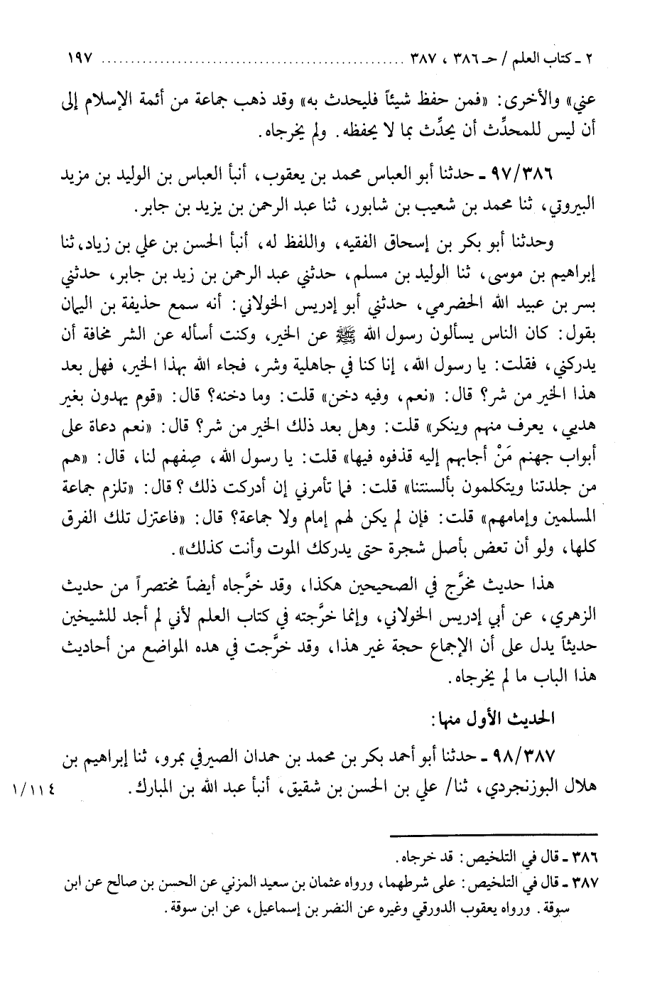 386 - حَدَّثَنَا أَبُو الْعَبَّاسِ مُحَمَّدُ بْنُ يَعْقُوبَ، أَنْبَأَ الْعَبَّاسُ بْنُ الْوَلِيدِ بْنِ مَزْيَدٍ الْبَيْرُوتِيُّ، ثنا مُحَمَّدُ بْنُ شُعَيْبِ بْنِ شَابُورَ، ثنا عَبْدُ الرَّحْمَنِ بْنُ يَزِيدَ بْنِ جَابِرٍ، وَحدثنا أَبُو بَكْرِ بْنُ إِسْحَاقَ الْفَقِيهُ، وَاللَّفْظُ لَهُ، أَنْبَأَ الْحَسَنُ بْنُ عَلِيِّ بْنِ زِيَادٍ، ثنا إِبْرَاهِيمُ بْنُ مُوسَى، ثنا الْوَلِيدُ بْنُ مُسْلِمٍ، حَدَّثَنِي عَبْدُ الرَّحْمَنِ بْنُ زَيْدِ بْنِ جَابِرٍ، حَدَّثَنِي بُسْرُ بْنُ عُبَيْدِ اللَّهِ الْحَضْرَمِيُّ، حَدَّثَنِي أَبُو إِدْرِيسَ الْخَوْلَانِيُّ، أَنَّهُ سَمِعَ حُذَيْفَةَ بْنَ الْيَمَانِ، يَقُولُ: كَانَ النَّاسُ يَسْأَلُونَ رَسُولَ اللَّهِ صَلَّى اللهُ عَلَيْهِ وَسَلَّمَ عَنِ الْخَيْرِ، وَكُنْتُ أَسْأَلُهُ عَنِ الشَّرِّ مَخَافَةَ أَنْ يُدْرِكَنِي، فَقُلْتُ: يَا رَسُولَ اللَّهِ، إِنَّا كُنَّا فِي جَاهِلِيَّةٍ وَشَرٍّ، فَجَاءَ اللَّهُ بِهَذَا الْخَيْرِ، فَهَلْ بَعْدَ هَذَا الْخَيْرِ مِنْ شَرٍّ؟ قَالَ: «نَعَمْ، وَفِيهِ دَخَنٌ» قُلْتُ: وَمَا دَخَنُهُ؟ قَالَ: «§قَوْمٌ يَهْدُونَ بِغَيْرِ هَدْيِي يُعْرَفُ مِنْهُمْ وَيُنْكَرُ» قُلْتُ: وَهَلْ بَعْدَ ذَلِكَ الْخَيْرِ مِنْ شَرٍّ؟، قَالَ: «نَعَمْ، دُعَاةٌ عَلَى أَبْوَابِ جَهَنَّمَ مَنْ أَجَابَهُمْ إِلَيْهِ قَذَفُوهُ فِيهَا» قُلْتُ: يَا رَسُولَ اللَّهِ، صِفْهُمْ لَنَا، قَالَ: «هُمْ مِنْ جِلْدَتِنَا وَيَتَكَلَّمُونَ بِأَلْسِنَتِنَا» قُلْتُ: فَمَا تَأْمُرُنِي إِنْ أَدْرَكْتُ ذَلِكَ؟ قَالَ: «تَلْزَمْ جَمَاعَةَ الْمُسْلِمِينَ وَإِمَامَهُمْ» قُلْتُ: فَإِنْ لَمْ يَكُنْ لَهُمْ إِمَامٌ وَلَا جَمَاعَةٌ؟ قَالَ: «فَاعْتَزِلْ تِلْكَ الْفِرَقَ كُلَّهَا، وَلَوْ أَنْ تَعَضَّ بِأَصْلِ شَجَرَةٍ حَتَّى يُدْرِكَكَ الْمَوْتُ وَأَنْتَ كَذَلِكَ» هَذَا حَدِيثٌ مُخَرَّجٌ فِي الصَّحِيحَيْنِ هَكَذَا، وَقَدْ خَرَّجَاهُ أَيْضًا مُخْتَصَرًا مِنْ حَدِيثِ الزُّهْرِيِّ، عَنْ أَبِي إِدْرِيسَ الْخَوْلَانِيِّ وَإِنَّمَا خَرَّجْتُهُ فِي كِتَابِ الْعِلْمِ لِأَنِّي لَمْ أَجِدْ لِلشَّيْخَيْنِ حَدِيثًا يَدُلُّ عَلَى أَنَّ الْإِجْمَاعَ حَجَّةٌ غَيْرَ هَذَا، وَقَدْ خَرَّجْتُ فِي هَذِهِ الْمَوَاضِعِ مِنْ أَحَادِيثِ هَذَا الْبَابِ مَا لَمْ يُخَرِّجَاهُ، الْحَدِيثُ الْأَوَّلُ مِنْهَا "K386 - قد خرجاه