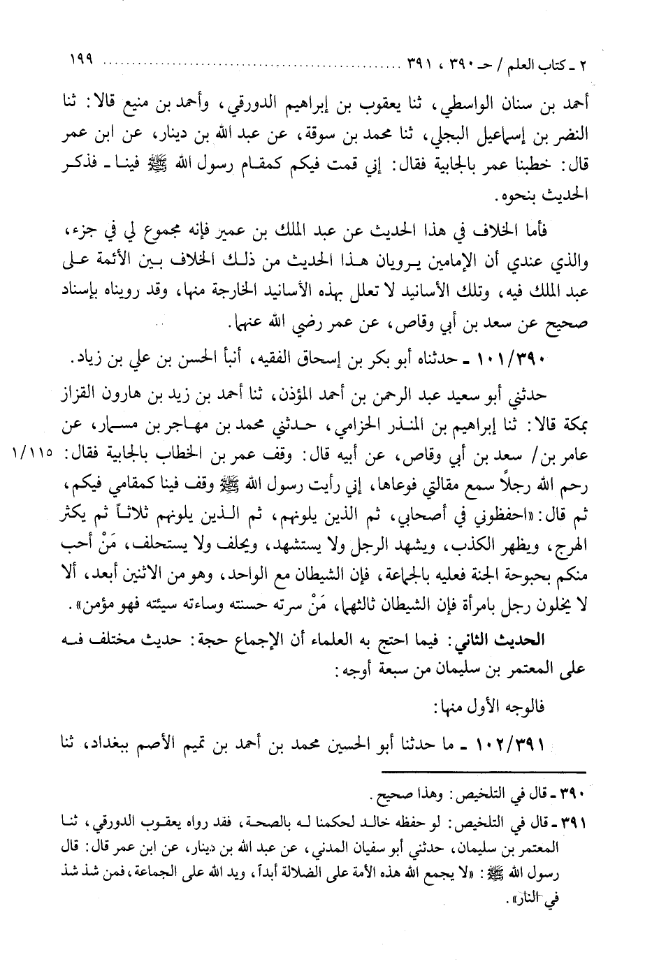 390 - حَدَّثَنَاهُ أَبُو بَكْرِ بْنُ إِسْحَاقَ الْفَقِيهُ، أَنْبَأَ الْحَسَنُ بْنُ عَلِيِّ بْنِ زِيَادٍ، حَدَّثَنِي أَبُو سَعِيدٍ عَبْدُ الرَّحْمَنِ بْنُ أَحْمَدَ الْمُؤَذِّنُ، ثنا أَحْمَدُ بْنُ زَيْدِ بْنِ هَارُونَ الْقَزَّازُ، بِمَكَّةَ، قَالَا: ثنا إِبْرَاهِيمُ بْنُ الْمُنْذِرِ الْحِزَامِيُّ، حَدَّثَنِي إِبْرَاهِيمُ بْنُ مُهَاجِرِ بْنِ مِسْمَارٍ، عَنْ عَامِرِ بْنِ سَعْدِ بْنِ أَبِي وَقَّاصٍ، عَنْ أَبِيهِ، قَالَ: وَقَفَ عُمَرُ بْنُ الْخَطَّابِ بِالْجَابِيَةِ، فَقَالَ: رَحِمَ اللَّهُ رَجُلًا سَمِعَ مَقَالَتِي فَوَعَاهَا، إِنِّي رَأَيْتُ رَسُولَ اللَّهِ صَلَّى اللهُ عَلَيْهِ وَسَلَّمَ وَقَفَ فِينَا كَمَقَامِي فِيكُمْ ثُمَّ، قَالَ: «§احْفَظُونِي فِي أَصْحَابِي، ثُمَّ الَّذِينَ يَلُونَهُمْ، ثُمَّ الَّذِينَ يَلُونَهُمْ» ثَلَاثًا «ثُمَّ يَكْثُرُ الْهَرْجُ، وَيَظْهَرُ الْكَذِبُ، وَيَشْهَدُ الرَّجُلُ وَلَا يُسْتَشْهَدُ، وَيَحْلِفُ وَلَا يُسْتَحْلَفُ، مَنْ أَحَبَّ مِنْكُمْ بُحْبُوحَةَ الْجَنَّةِ فَعَلَيْهِ بِالْجَمَاعَةِ، فَإِنَّ الشَّيْطَانَ مَعَ الْوَاحِدِ، وَهُوَ مِنَ الِاثْنَيْنِ أَبْعَدُ، أَلَا لَا يَخْلُوَنَّ رَجُلٌ بِامْرَأَةٍ فَإِنَّ الشَّيْطَانَ ثَالِثُهُمَا، مَنْ سَرَّتْهُ حَسَنَتُهُ وَسَاءَتْهُ سَيِّئَتُهُ فَهُوَ مُؤْمِنٌ» . " الْحَدِيثُ الثَّانِي فِيمَا احْتَجَّ بِهِ الْعُلَمَاءُ أَنَّ الْإِجْمَاعَ حَجَّةٌ حَدِيثٌ مُخْتَلَفٌ فِيهِ عَنِ الْمُعْتَمِرِ بْنِ سُلَيْمَانَ مِنْ سَبْعَةِ أَوْجُهٍ: فَالْوَجْهُ الْأَوَّلُ مِنْهَاK390 - وهذا صحيح