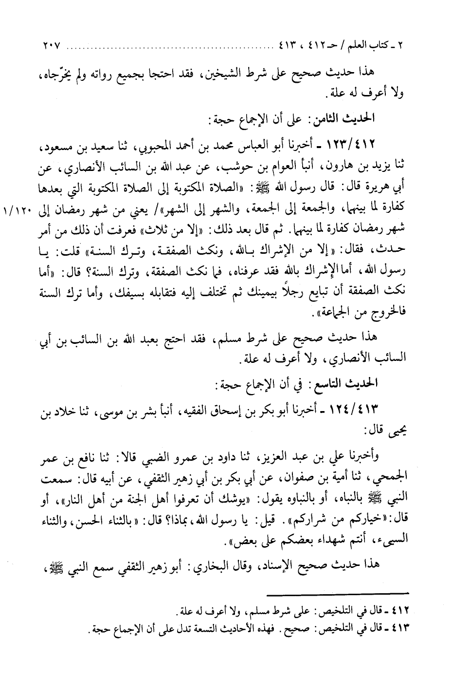 412 - أَخْبَرَنَا أَبُو الْعَبَّاسِ مُحَمَّدُ بْنُ أَحْمَدَ الْمَحْبُوبِيُّ، ثنا سَعِيدُ بْنُ مَسْعُودٍ، ثنا يَزِيدُ بْنُ هَارُونَ، أَنْبَأَ الْعَوَّامُ بْنُ حَوْشَبٍ، عَنْ عَبْدِ اللَّهِ بْنِ السَّائِبِ الْأَنْصَارِيِّ، عَنْ أَبِي هُرَيْرَةَ، قَالَ: قَالَ رَسُولُ اللَّهِ صَلَّى اللهُ عَلَيْهِ وَسَلَّمَ: §«الصَّلَاةُ الْمَكْتُوبَةُ إِلَى الصَّلَاةِ الْمَكْتُوبَةِ الَّتِي بَعْدَهَا كَفَّارَةٌ لِمَا بَيْنَهُمَا، وَالْجُمُعَةُ إِلَى الْجُمُعَةِ، وَالشَّهْرُ إِلَى الشَّهْرِ - يَعْنِي مِنْ شَهْرِ رَمَضَانَ إِلَى شَهْرِ رَمَضَانَ كَفَّارَةٌ لِمَا بَيْنَهُمَا» ثُمَّ قَالَ بَعْدَ ذَلِكَ: «إِلَّا مِنْ ثَلَاثٍ» فَعَرَفْتُ أَنَّ ذَلِكَ مِنْ أَمْرٍ حَدَثَ، فَقَالَ: «إِلَّا مِنَ الْإِشْرَاكِ بِاللَّهِ وَنَكْثِ الصَّفْقَةِ وَتَرْكِ السُّنَّةِ» قُلْتُ: يَا رَسُولَ اللَّهِ: أَمَّا الْإِشْرَاكُ بِاللَّهِ فَقَدْ عَرَفْنَاهُ، فَمَا نَكْثُ الصَّفْقَةِ وَتَرْكُ السُّنَّةِ؟ قَالَ: " أَمَّا نَكْثُ الصَّفْقَةِ: أَنْ تَبَايَعَ رَجُلًا بِيَمِينِكَ، ثُمَّ تَخْتَلِفَ إِلَيْهِ فُتَقَابِلَهُ بِسَيْفِكَ، وَأَمَّا تَرْكُ السُّنَّةِ: فَالْخُرُوجُ مِنَ الْجَمَاعَةِ «.» هَذَا حَدِيثٌ صَحِيحٌ عَلَى شَرْطِ مُسْلِمٍ، فَقَدِ احْتَجَّ بِعَبْدِ اللَّهِ بْنِ السَّائِبِ بْنِ أَبِي السَّائِبِ الْأَنْصَارِيِّ، وَلَا أَعْرِفُ لَهُ عِلَّةً. الْحَدِيثُ التَّاسِعُ فِي أَنَّ الْإِجْمَاعَ حُجَّةٌ "K412 - على شرط مسلم ولا أعرف له علة