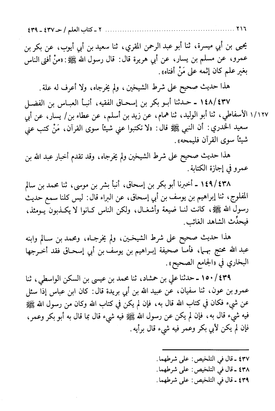 437 - حَدَّثَنَا أَبُو بَكْرِ بْنُ إِسْحَاقَ الْفَقِيهُ، أَنْبَأَ الْعَبَّاسُ بْنُ الْفَضْلِ الْأَسْفَاطِيُّ، ثنا أَبُو الْوَلِيدِ، ثنا هَمَّامٌ، عَنْ زَيْدِ بْنِ أَسْلَمَ، عَنْ عَطَاءِ بْنِ يَسَارٍ، عَنْ أَبِي سَعِيدٍ الْخُدْرِيِّ، أَنَّ النَّبِيَّ صَلَّى اللهُ عَلَيْهِ وَسَلَّمَ، قَالَ: §«لَا تَكْتُبُوا عَنِّي شَيْئًا سِوَى الْقُرْآنِ مَنْ كَتَبَ عَنِّي شَيْئًا سِوَى الْقُرْآنِ فَلْيَمْحُهُ» . «هَذَا حَدِيثٌ صَحِيحٌ عَلَى شَرْطِ الشَّيْخَيْنِ، وَلَمْ يُخَرِّجَاهُ، وَقَدْ تَقَدَّمَ أَخْبَارُ عَبْدِ اللَّهِ بْنِ عَمْرٍو فِي إِجَازَةِ الْكِتَابَةِ» K437 - على شرطهما