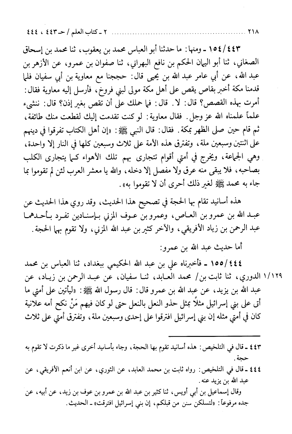 443 - وَمِنْهَا مَا حَدَّثَنَا أَبُو الْعَبَّاسِ مُحَمَّدُ بْنُ يَعْقُوبَ، ثنا مُحَمَّدُ بْنُ إِسْحَاقَ الصَّغَانِيُّ، ثنا أَبُو الْيَمَانِ الْحَكَمُ بْنُ نَافِعٍ الْبَهْرَانِيُّ، ثنا صَفْوَانُ بْنُ عَمْرٍو، عَنِ الْأَزْهَرِ بْنِ عَبْدِ اللَّهِ، عَنْ أَبِي عَامِرٍ عَبْدِ اللَّهِ بْنِ لُحَيٍّ، قَالَ: حَجَجْنَا مَعَ مُعَاوِيَةَ بْنِ أَبِي سُفْيَانَ، فَلَمَّا قَدِمْنَا مَكَّةَ، أُخْبِرَ بِقَاصٍّ يَقُصُّ عَلَى أَهْلِ مَكَّةَ مَوْلًى لِبَنِي فَرُّوخٍ، فَأَرْسَلَ إِلَيْهِ مُعَاوِيَةُ فَقَالَ: أُمِرْتَ بِهَذِهِ الْقِصَصِ؟ قَالَ: لَا، قَالَ: فَمَا حَمَلَكَ عَلَى أَنْ تَقُصَّ بِغَيْرِ إِذْنٍ، قَالَ: نُنْشِئُ عِلْمًا عَلَمَنَاهُ اللَّهُ عَزَّ وَجَلَّ، فَقَالَ مُعَاوِيَةُ: لَوْ كُنْتُ تَقَدَّمْتُ إِلَيْكَ لَقَطَعْتُ مِنْكَ طَائِفَةً، ثُمَّ قَامَ حِينَ صَلَّى الظُّهْرَ بِمَكَّةَ، فَقَالَ: قَالَ النَّبِيُّ صَلَّى اللهُ عَلَيْهِ وَسَلَّمَ: «إِنَّ §أَهْلَ الْكِتَابِ تَفَرَّقُوا فِي دِينِهِمْ عَلَى اثْنَتَيْنِ وَسَبْعِينَ مِلَّةً، وَتَفْتَرِقُ هَذِهِ الْأُمَّةُ عَلَى ثَلَاثٍ وَسَبْعِينَ كُلُّهَا فِي النَّارِ إِلَّا وَاحِدَةً وَهِيَ الْجَمَاعَةُ، وَيَخْرُجُ مِنْ أُمَّتِي أَقْوَامٌ تَتَجَارَى بِهِمْ تِلْكَ الْأَهْوَاءُ كَمَا يَتَجَارَى الْكَلْبُ بِصَاحِبِهِ، فَلَا يَبْقَى مِنْهُ عِرْقٌ وَلَا مَفْصِلٌ إِلَّا دَخَلَهُ، وَاللَّهِ يَا مَعْشَرَ الْعَرَبِ لَئِنْ لَمْ تَقُومُوا بِمَا جَاءَ بِهِ مُحَمَّدٌ صَلَّى اللهُ عَلَيْهِ وَسَلَّمَ لَغَيْرُ ذَلِكَ أَحْرَى أَنْ لَا تَقُومُوا بِهِ» . «هَذِهِ أَسَانِيدُ تُقَامُ بِهَا الْحُجَّةُ فِي تَصْحِيحِ هَذَا الْحَدِيثِ، وَقَدْ رُوِيَ هَذَا الْحَدِيثُ عَنْ عَبْدِ اللَّهِ بْنِ عَمْرِو بْنِ الْعَاصِ وَعَمْرِو بْنِ عَوْفٍ الْمُزَنِيِّ بِإِسْنَادَيْنِ تَفَرَّدَ بِأَحَدِهِمَا عَبْدُ الرَّحْمَنِ بْنُ زِيَادٍ الْأَفْرِيقِيُّ، وَالْآخَرُ كَثِيرُ بْنُ عَبْدِ اللَّهِ الْمُزَنِيُّ، وَلَا تَقُومُ بِهِمَا الْحُجَّةُ» K443 - هذه أسانيد تقوم بها الحجة