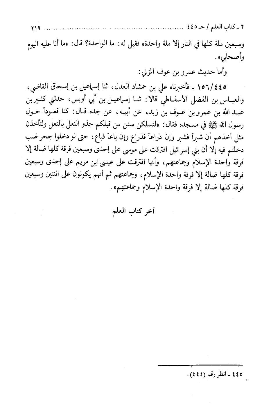 445 - فَأَخْبَرَنَاهُ عَلِيُّ بْنُ حَمْشَاذَ الْعَدْلُ، ثنا إِسْمَاعِيلُ بْنُ إِسْحَاقَ الْقَاضِي، وَالْعَبَّاسُ بْنُ الْفَضْلِ الْأَسْفَاطِيُّ، قَالَا: ثنا إِسْمَاعِيلُ بْنُ أَبِي أُوَيْسٍ، حَدَّثَنِي كَثِيرُ بْنُ عَبْدِ اللَّهِ بْنِ عَمْرِو بْنِ عَوْفِ بْنِ زَيْدٍ، عَنْ أَبِيهِ، عَنْ جَدِّهِ، قَالَ: كُنَّا قُعُودًا حَوْلَ رَسُولِ اللَّهِ صَلَّى اللهُ عَلَيْهِ وَسَلَّمَ فِي مَسْجِدِهِ، فَقَالَ: «§لَتَسْلُكُنَّ سَنَنَ مَنْ قَبْلَكُمْ حَذْوَ النَّعْلِ بِالنَّعْلِ، وَلَتَأْخُذُنَّ مِثْلَ أَخْذِهِمْ إِنْ شِبْرًا فَشِبْرٌ، وَإِنْ ذِرَاعًا فَذِرَاعٌ، وَإِنْ بَاعًا فَبَاعٌ، حَتَّى لَوْ دَخَلُوا جُحْرَ ضَبٍّ دَخَلْتُمْ فِيهِ، أَلَا إِنَّ بَنِي إِسْرَائِيلَ افْتَرَقَتْ عَلَى مُوسَى عَلَى إِحْدَى وَسَبْعِينَ فِرْقَةً كُلُّهَا ضَالَّةٌ إِلَّا فِرْقَةٌ وَاحِدَةٌ الْإِسْلَامُ وَجَمَاعَتُهُمْ، وَإِنَّهَا افْتَرَقَتْ عَلَى عِيسَى ابْنِ مَرْيَمَ عَلَى إِحْدَى وَسَبْعِينَ فِرْقَةً كُلُّهَا ضَالَّةٌ إِلَّا فِرْقَةٌ وَاحِدَةٌ الْإِسْلَامُ وَجَمَاعَتُهُمْ، ثُمَّ إِنَّهُمْ يَكُونُونَ عَلَى اثْنَتَيْنِ وَسَبْعِينَ فِرْقَةً كُلُّهَا ضَالَّةٌ إِلَّا فِرْقَةٌ وَاحِدَةٌ الْإِسْلَامُ وَجَمَاعَتُهُمْ» آخِرُ -[220]- كِتَابِ الْعِلْمِ