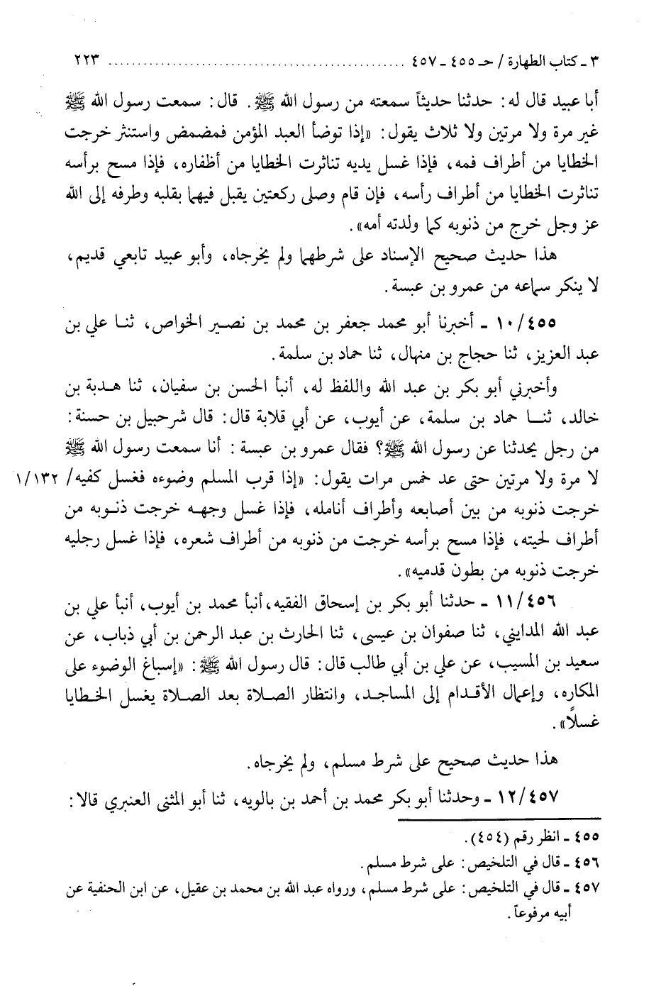 455 - أَخْبَرَنَا أَبُو مُحَمَّدٍ جَعْفَرُ بْنُ مُحَمَّدِ بْنِ نُصَيْرٍ الْخَوَّاصُ، ثنا عَلِيُّ بْنُ عَبْدِ الْعَزِيزِ، ثنا حَجَّاجُ بْنُ مِنْهَالٍ، ثنا حَمَّادُ بْنُ سَلَمَةَ، وَأَخْبَرَنِي أَبُو بَكْرِ بْنُ عَبْدِ اللَّهِ، وَاللَّفْظُ لَهُ، أَنْبَأَ الْحَسَنُ بْنُ سُفْيَانَ، ثنا هُدْبَةُ بْنُ خَالِدٍ، ثنا حَمَّادُ بْنُ سَلَمَةَ، عَنْ أَيُّوبَ، عَنْ أَبِي قِلَابَةَ، قَالَ: قَالَ شُرَحْبِيلُ بْنُ حَسَنَةَ: مَنْ رَجُلٌ يُحَدِّثُنَا عَنْ رَسُولِ اللَّهِ صَلَّى اللهُ عَلَيْهِ وَسَلَّمَ؟، فَقَالَ عَمْرُو بْنُ عَبَسَةَ: أَنَا سَمِعْتُ رَسُولَ اللَّهِ صَلَّى اللهُ عَلَيْهِ وَسَلَّمَ لَا مَرَّةً وَلَا مَرَّتَيْنِ حَتَّى عَدَّ خَمْسَ مَرَّاتٍ، يَقُولُ: §«إِذَا قَرَّبَ الْمُسْلِمُ وَضُوءَهُ فَغَسَلَ كَفَّيْهِ خَرَجَتْ ذُنُوبُهُ مِنْ بَيْنِ أَصَابِعِهِ وَأَطْرَافِ أَنَامِلِهِ، فَإِذَا غَسَلَ وَجْهَهُ خَرَجَتْ ذُنُوبُهُ مِنْ أَطْرَافِ لِحْيَتِهِ، فَإِذَا مَسَحَ بِرَأْسِهِ خَرَجَتْ ذُنُوبُهُ مِنْ أَطْرَافِ شَعْرِهِ، فَإِذَا غَسَلَ رِجْلَيْهِ خَرَجَتْ ذُنُوبُهُ مِنْ بُطُونِ قَدَمَيْهِ»