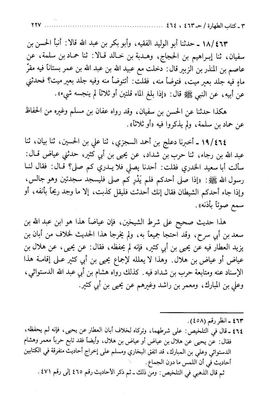 463 - حَدَّثَنَا أَبُو الْوَلِيدِ الْفَقِيهُ، وَأَبُو بَكْرِ بْنُ عَبْدِ اللَّهِ، قَالَا: أَنْبَأَ الْحَسَنُ بْنُ سُفْيَانَ، ثنا إِبْرَاهِيمُ بْنُ الْحَجَّاجِ، وَهُدْبَةُ بْنُ خَالِدٍ، قَالَا: ثنا حَمَّادُ بْنُ سَلَمَةَ، عَنْ عَاصِمِ بْنِ الْمُنْذِرِ بْنِ الزُّبَيْرِ، قَالَ: دَخَلْتُ مَعَ عُبَيْدِ اللَّهِ بْنِ عَبْدِ اللَّهِ بْنِ عُمَرَ بُسْتَانًا فِيهِ مَقَرُ مَاءٍ فِيهِ جِلْدُ بَعِيرٍ مَيِّتٍ فَتَوَضَّأَ مِنْهُ فَقُلْتُ: أَتَتَوَضَّأُ مِنْهُ وَفِيهِ جِلْدُ بَعِيرٍ مَيِّتٍ؟ فَحَدَّثَنِي عَنْ أَبِيهِ، عَنِ النَّبِيِّ صَلَّى اللهُ عَلَيْهِ وَسَلَّمَ، قَالَ: §«إِذَا بَلَغَ الْمَاءُ قُلَّتَيْنِ أَوْ ثَلَاثًا لَمْ يُنَجِّسْهُ شَيْءٌ» . هَكَذَا حَدَّثَنَا، عَنِ الْحَسَنِ بْنِ سُفْيَانَ، وَقَدْ رَوَاهُ عَفَّانُ بْنُ مُسْلِمٍ، وَغَيْرُهُ مِنَ الْحُفَّاظِ، عَنْ حَمَّادِ بْنِ سَلَمَةَ وَلَمْ يَذْكُرُوا فِيهِ أَوْ ثَلَاثًا