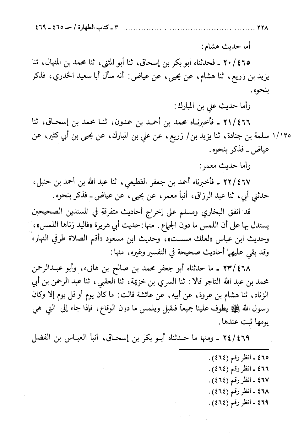 468 - مَا حَدَّثَنَاهُ أَبُو جَعْفَرٍ مُحَمَّدُ بْنُ صَالِحِ بْنِ هَانِئٍ، وَأَبُو عَبْدِ الرَّحْمَنِ مُحَمَّدُ بْنُ عَبْدِ اللَّهِ التَّاجِرُ، قَالَا: ثنا السَّرِيُّ بْنُ خُزَيْمَةَ، ثنا الْعَقَبِيُّ، ثنا عَبْدُ الرَّحْمَنِ بْنُ أَبِي الزِّنَادِ، ثنا هِشَامُ بْنُ عُرْوَةَ، عَنْ أَبِيهِ، عَنْ عَائِشَةَ، قَالَتْ: «مَا كَانَ يَوْمٌ أَوْ قَلَّ يَوْمٌ إِلَّا وَكَانَ رَسُولُ اللَّهِ صَلَّى اللهُ عَلَيْهِ وَسَلَّمَ §يَطُوفُ عَلَيْنَا جَمِيعًا فَيُقَبِّلُ وَيَلْمِسُ مَا دُونَ الْوِقَاعِ، فَإِذَا جَاءَ إِلَى الَّتِي هِيَ يَوْمُهَا ثَبَتَ عِنْدَهَا»