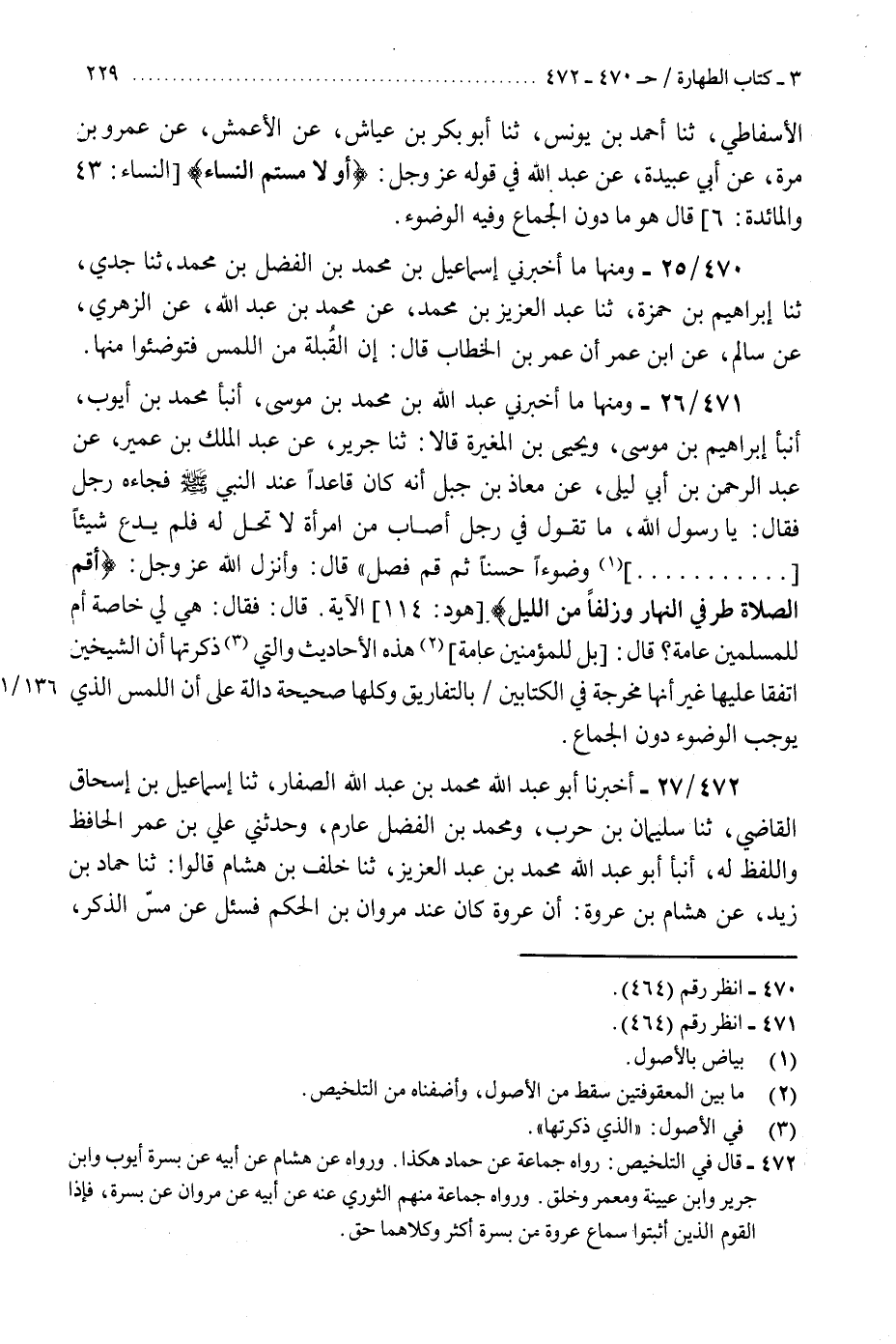 471 - وَمِنْهَا مَا أَخْبَرَنِي عَبْدُ اللَّهِ بْنُ مُحَمَّدِ بْنِ مُوسَى، أَنْبَأَ مُحَمَّدُ بْنُ أَيُّوبَ، أَنْبَأَ إِبْرَاهِيمُ بْنُ مُوسَى، وَيَحْيَى بْنُ الْمُغِيرَةِ، قَالَا: ثنا جَرِيرٌ، عَنْ عَبْدِ الْمَلِكِ بْنِ عُمَيْرٍ، عَنْ عَبْدِ الرَّحْمَنِ بْنِ أَبِي لَيْلَى، عَنْ مُعَاذِ بْنِ جَبَلٍ، أَنَّهُ كَانَ قَاعِدًا عِنْدَ النَّبِيِّ صَلَّى اللهُ عَلَيْهِ وَسَلَّمَ فَجَاءَهُ رَجُلٌ، فَقَالَ: يَا رَسُولَ اللَّهِ مَا تَقُولُ فِي رَجُلٍ أَصَابَ مِنَ امْرَأَةٍ لَا تَحِلُّ لَهُ فَلَمْ يَدَعْ شَيْئًا. . . «وُضُوءًا حَسَنًا ثُمَّ قُمْ فَصَلِّ» ، قَالَ: وَأَنْزَلَ اللَّهُ عَزَّ وَجَلَّ {أَقِمِ الصَّلَاةَ طَرَفَيِ النَّهَارِ وَزُلَفًا مِنَ اللَّيْلِ} [هود: 114] الْآيَةَ، قَالَ: فَقَالَ: " هِيَ لِي خَاصَّةً أَمْ لِلْمُسْلِمِينَ عَامَّةً؟ قَالَ: §«بَلْ لِلْمُؤْمِنِينَ عَامَّةً» . «هَذِهِ الْأَحَادِيثُ وَالَّتِي ذَكَرْتُهَا أَنَّ الشَّيْخَيْنِ اتَّفَقَا عَلَيْهَا غَيْرَ أَنَّهَا مُخَرَّجَةٌ فِي الْكِتَابَيْنِ بِالتَّفَارِيقِ، وَكُلُّهَا صَحِيحَةٌ دَالَّةُ عَلَى أَنَّ اللَّمْسَ الَّذِي يُوجِبُ الْوُضُوءَ دُونَ الْجِمَاعِ»