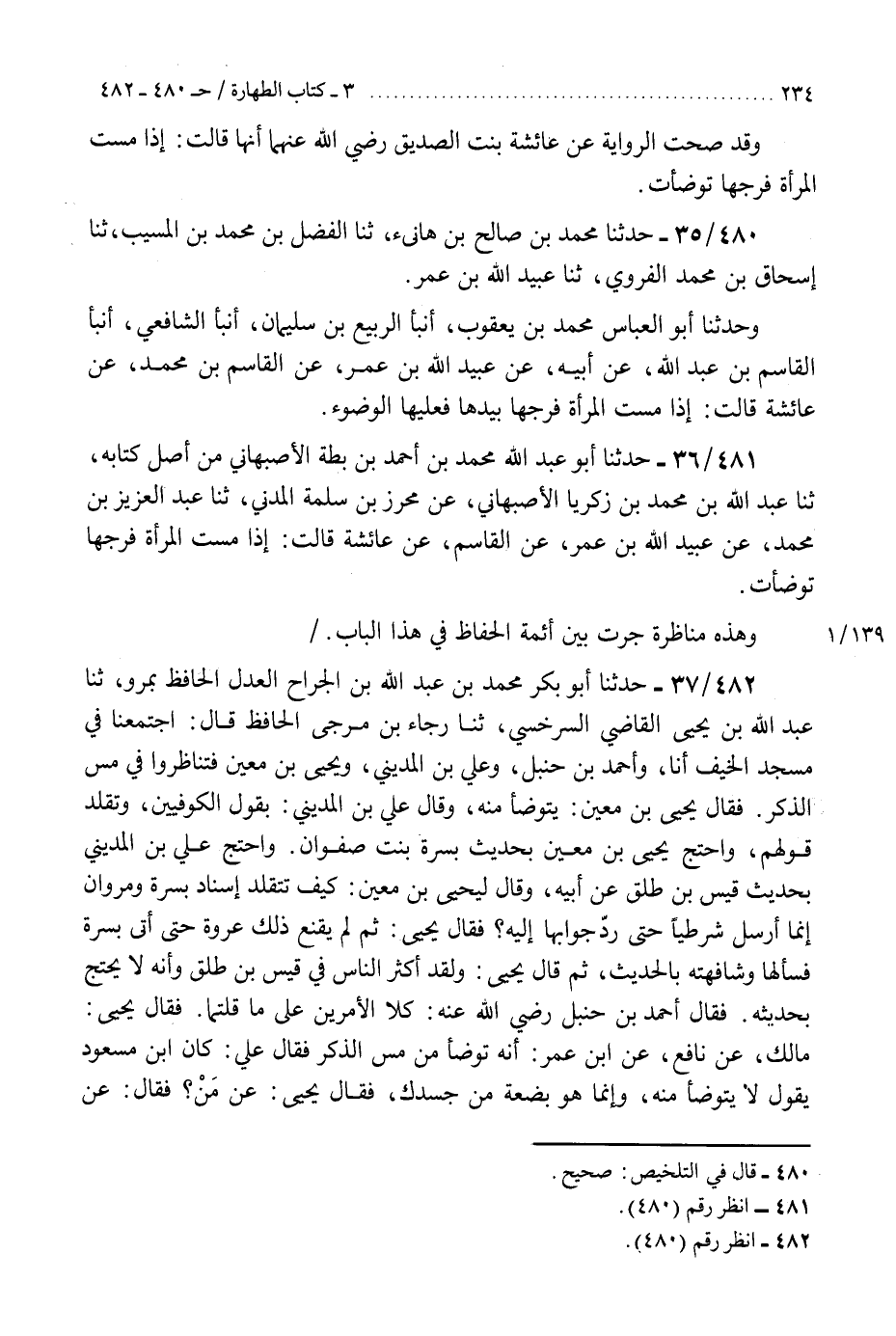 481 - حَدَّثَنَا أَبُو عَبْدِ اللَّهِ مُحَمَّدُ بْنُ أَحْمَدَ بْنِ بَطَّةَ الْأَصْبَهَانِيُّ مِنْ أَصْلِ كِتَابِهِ، ثنا عَبْدُ اللَّهِ بْنُ مُحَمَّدِ بْنِ زَكَرِيَّا الْأَصْبَهَانِيُّ، عَنْ مُحْرِزِ بْنِ سَلَمَةَ الْمَدَنِيُّ، ثنا عَبْدُ الْعَزِيزِ بْنُ مُحَمَّدٍ، عَنْ عُبَيْدِ اللَّهِ بْنِ عُمَرَ، عَنِ الْقَاسِمِ، عَنْ عَائِشَةَ، قَالَتْ: §«إِذَا مَسَّتِ الْمَرْأَةُ فَرْجَهَا تَوَضَّأَتْ» . «وَهَذِهِ مُنَاظَرَةٌ جَرَتْ بَيْنَ أَئِمَّةِ الْحُفَّاظِ فِي هَذَا الْبَابِ»