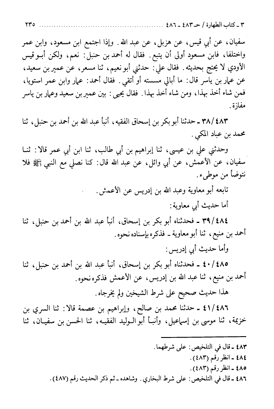 486 - حَدَّثَنَا مُحَمَّدُ بْنُ صَالِحٍ، وَإِبْرَاهِيمُ بْنُ عِصْمَةَ، قَالَا: ثنا السَّرِيُّ بْنُ خُزَيْمَةَ، ثنا مُوسَى بْنُ إِسْمَاعِيلَ، وَأَنْبَأَ أَبُو الْوَلِيدِ الْفَقِيهُ، ثنا الْحَسَنُ بْنُ سُفْيَانَ، ثنا إِبْرَاهِيمُ بْنُ الْحَجَّاجِ، قَالَا: ثنا عَبْدُ اللَّهِ بْنُ الْمُثَنَّى الْأَنْصَارِيُّ، عَنْ ثُمَامَةَ، عَنْ أَنَسٍ، أَنَّ النَّبِيَّ صَلَّى اللهُ عَلَيْهِ وَسَلَّمَ لَمْ يَخْلَعْ نَعْلَيْهِ فِي الصَّلَاةِ قَطُّ إِلَّا مَرَّةً وَاحِدَةً خَلَعَ فَخَلَعَ النَّاسُ، فَقَالَ: «مَا لُكُمْ» قَالُوا: خَلَعْتَ فَخَلَعْنَا، فَقَالَ: «إِنَّ §جِبْرِيلَ أَخْبَرَنِي أَنَّ فِيهِمَا قَذَرًا - أَوْ أَذًى» . «هَذَا حَدِيثٌ صَحِيحٌ عَلَى شَرْطِ الْبُخَارِيِّ، فَقَدِ احْتَجَّ بِعَبْدِ اللَّهِ بْنِ الْمُثَنَّى وَلَمْ يُخَرِّجَاهُ، وَشَاهِدَهُ الْحَدِيثُ الْمَشْهُورُ عَنْ مَيْمُونٍ الْأَعْوَرِ» K486 - على شرط البخاري