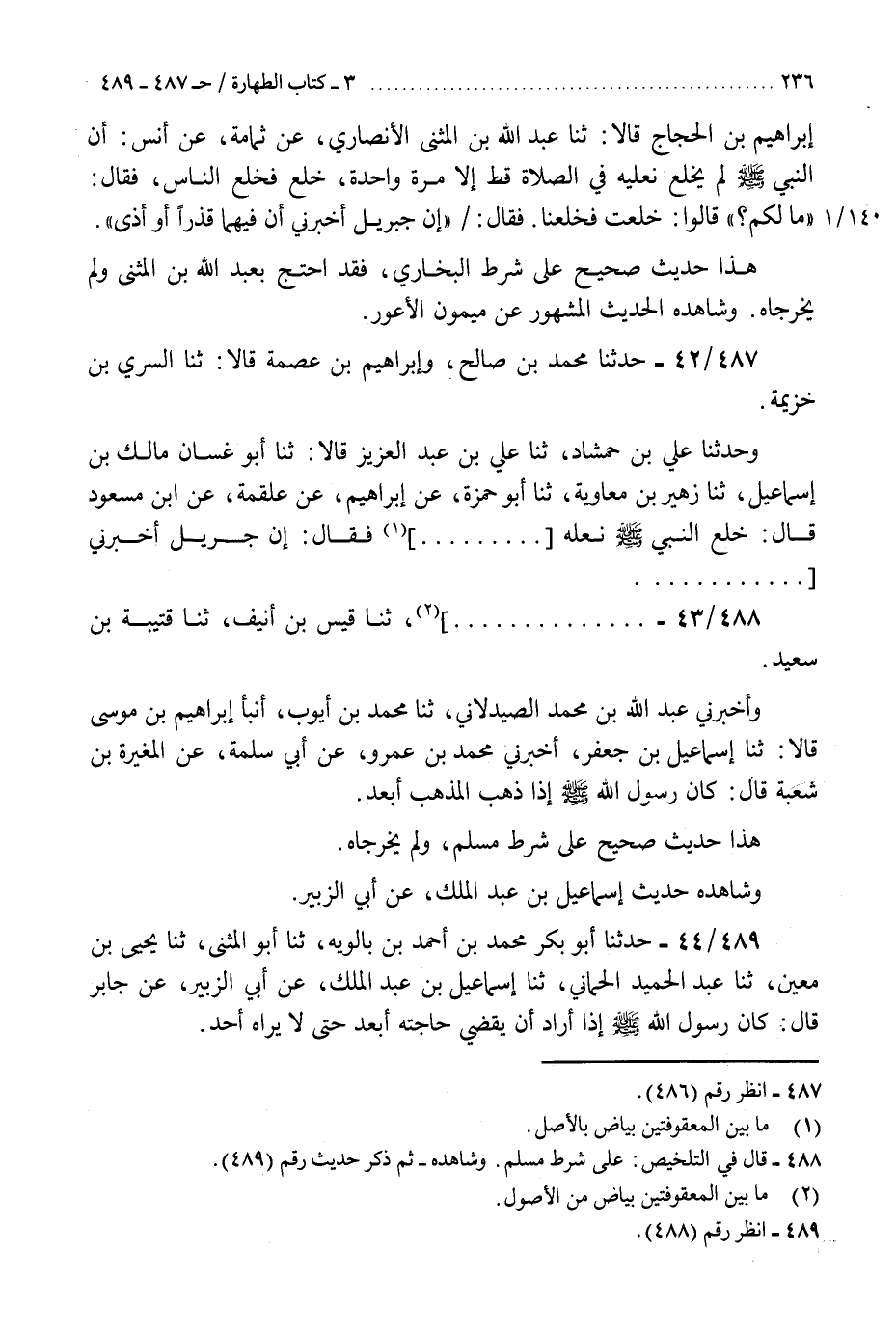 488 - ثنا قَيْسُ بْنُ أُنَيْفٍ، ثنا قُتَيْبَةُ بْنُ سَعِيدٍ، وَأَخْبَرَنِي عَبْدُ اللَّهِ بْنُ مُحَمَّدٍ الصَّيْدَلَانِيُّ، ثنا مُحَمَّدُ بْنُ أَيُّوبَ، أَنْبَأَ إِبْرَاهِيمُ بْنُ مُوسَى، قَالَا: ثنا إِسْمَاعِيلُ بْنُ جَعْفَرٍ، أَخْبَرَنِي مُحَمَّدُ بْنُ عَمْرٍو، عَنْ أَبِي سَلَمَةَ، عَنِ الْمُغِيرَةِ بْنِ شُعْبَةَ، قَالَ: كَانَ رَسُولُ اللَّهِ صَلَّى اللهُ عَلَيْهِ وَسَلَّمَ §إِذَا ذَهَبَ الْمَذْهَبَ أَبْعَدَ «.» هَذَا حَدِيثٌ صَحِيحٌ عَلَى شَرْطِ مُسْلِمٍ، وَلَمْ يُخَرِّجَاهُ ". وَشَاهِدَهُ حَدِيثُ إِسْمَاعِيلَ بْنِ عَبْدِ الْمَلِكِ، عَنْ أَبِي الزُّبَيْرِK488 - على شرط مسلم
