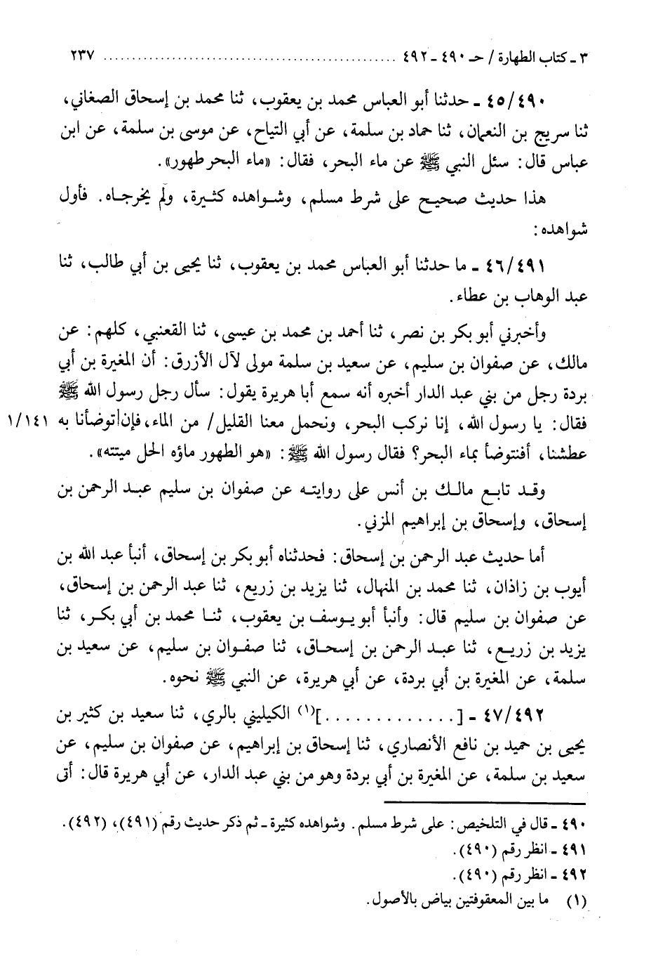 491 - مَا حَدَّثَنَا أَبُو الْعَبَّاسِ مُحَمَّدُ بْنُ يَعْقُوبَ، ثنا يَحْيَى بْنُ أَبِي طَالِبٍ، ثنا عَبْدُ الْوَهَّابِ بْنُ عَطَاءٍ، وَأَخْبَرَنِي أَبُو بَكْرِ بْنُ نَصْرٍ، ثنا أَحْمَدُ بْنُ مُحَمَّدِ بْنِ عِيسَى، ثنا الْقَعْنَبِيُّ، كُلُّهُمْ، عَنْ مَالِكٍ، عَنْ صَفْوَانَ بْنِ سُلَيْمٍ، عَنْ سَعِيدِ بْنِ سَلَمَةَ، مَوْلًى لِآلِ الْأَزْرَقِ، أَنَّ الْمُغِيرَةَ بْنَ أَبِي بُرْدَةَ، رَجُلٌ مِنْ بَنِي عَبْدِ الدَّارِ، أَخْبَرَهُ، أَنَّهُ سَمِعَ أَبَا هُرَيْرَةَ، يَقُولُ: سَأَلَ رَجُلٌ رَسُولَ اللَّهِ صَلَّى اللهُ عَلَيْهِ وَسَلَّمَ فَقَالَ: يَا رَسُولَ اللَّهِ، إِنَّا نَرْكَبُ الْبَحْرَ وَنَحْمِلُ مَعَنَا الْقَلِيلَ مِنَ الْمَاءِ، فَإِنْ تَوَضَّأْنَا بِهِ عَطِشْنَا أَفَنَتَوَضَّأُ بِمَاءِ الْبَحْرِ؟ فَقَالَ رَسُولُ اللَّهِ صَلَّى اللهُ عَلَيْهِ وَسَلَّمَ: §«هُوَ الطَّهُورُ مَاؤُهُ الْحِلُّ مَيْتَتُهُ» . وَقَدْ تَابَعَ مَالِكَ بْنَ أَنَسٍ عَلَى رِوَايَتِهِ، عَنْ صَفْوَانَ بْنِ سُلَيْمٍ عَبْدُ الرَّحْمَنِ بْنُ إِسْحَاقَ، وَإِسْحَاقُ بْنُ إِبْرَاهِيمَ الْمُزَنِيُّ. أَمَا حَدِيثُ عَبْدِ الرَّحْمَنِ بْنِ إِسْحَاقَ، فَحَدَّثَنَاهُ أَبُو بَكْرِ بْنُ إِسْحَاقَ أَنْبَأَ عَبْدُ اللَّهِ بْنُ أَيُّوبَ بْنِ زَاذَانَ، ثنا مُحَمَّدُ بْنُ الْمِنْهَالِ، ثنا يَزِيدُ بْنُ زُرَيْعٍ، ثنا عَبْدُ الرَّحْمَنِ بْنُ إِسْحَاقَ، عَنْ صَفْوَانَ بْنِ سُلَيْمٍ، قَالَ: وَأَنْبَأَ أَبُو يُوسُفَ بْنُ يَعْقُوبَ، ثنا مُحَمَّدُ بْنُ أَبِي بَكْرٍ، ثنا يَزِيدُ بْنُ زُرَيْعٍ، ثنا عَبْدُ الرَّحْمَنِ بْنُ إِسْحَاقَ، ثنا صَفْوَانُ بْنُ سُلَيْمٍ، عَنْ سَعِيدِ بْنِ سَلَمَةَ، عَنِ الْمُغِيرَةِ بْنِ أَبِي بُرْدَةَ، عَنْ أَبِي هُرَيْرَةَ، عَنِ النَّبِيِّ صَلَّى اللهُ عَلَيْهِ وَسَلَّمَ نَحْوَهُ