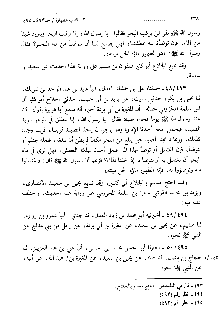 493 - حَدَّثَنَاهُ عَلِيُّ بْنُ حَمْشَاذَ الْعَدْلُ، أَنْبَأَ عُبَيْدُ بْنُ عَبْدِ الْوَاحِدِ بْنِ شَرِيكٍ، ثنا يَحْيَى بْنُ بَكْرٍ، حَدَّثَنِي اللَّيْثُ، عَنْ يَزِيدَ بْنِ أَبِي حَبِيبٍ، حَدَّثَنِي الْجُلَاحُ أَبُو كَثِيرٍ، أَنَّ ابْنَ سَلَمَةَ الْمَخْزُومِيَّ، حَدَّثَهُ، أَنَّ الْمُغِيرَةَ بْنَ أَبِي بُرْدَةَ، أَخْبَرَهُ، أَنَّهُ سَمِعَ أَبَا هُرَيْرَةَ، يَقُولُ: كُنَّا عِنْدَ رَسُولِ اللَّهِ صَلَّى اللهُ عَلَيْهِ وَسَلَّمَ يَوْمًا فَجَاءَهُ صَيَّادٌ، فَقَالَ: يَا رَسُولَ اللَّهِ، إِنَّا نَنْطَلِقُ فِي الْبَحْرِ نُرِيدُ الصَّيْدَ فَيَحْمِلُ مَعَهُ أَحَدُنَا الْإِدَاوَةَ وَهُوَ يَرْجُو أَنْ يَأْخُذَ الصَّيْدَ قَرِيبًا، فَرُبَّمَا وَجَدَهُ كَذَلِكَ، وَرُبَّمَا لَمْ يَجِدِ الصَّيْدَ حَتَّى يَبْلُغَ مِنَ الْبَحْرِ مَكَانًا لَمْ يَظُنَّ أَنْ يَبْلُغَهُ، فَلَعَلَّهُ يَحْتَلِمُ أَوْ يَتَوَضَّأُ، فَإِنِ اغْتَسَلَ أَوْ تَوَضَّأَ بِهَذَا الْمَاءِ فَلَعَلَّ أَحَدُنَا يُهْلِكُهُ الْعَطَشُ فَهَلْ تَرَى فِي مَاءِ الْبَحْرِ أَنْ نَغْتَسِلَ به أَوْ نَتَوَضَّأَ بِهِ إِذَا خِفْنَا ذَلِكَ، فَزُعِمَ أَنَّ رَسُولَ اللَّهِ صَلَّى اللهُ عَلَيْهِ وَسَلَّمَ قَالَ: §«اغْتَسِلُوا مِنْهُ وَتَوَضَّئُوا بِهِ فَإِنَّهُ الطَّهُورُ مَاؤُهُ الْحِلُّ مَيْتَتُهُ» . «وَقَدِ احْتَجَّ مُسْلِمٌ بِالْجُلَاحِ أَبِي كَثِيرٍ وَقَدْ تَابَعَ يَحْيَى بْنُ سَعِيدٍ الْأَنْصَارِيُّ وَيَزِيدُ بْنُ مُحَمَّدٍ الْقُرَشِيُّ سَعِيدَ بْنَ سَلَمَةَ الْمَخْزُومِيَّ عَلَى رِوَايَةِ هَذَا الْحَدِيثِ وَاخْتُلِفَ عَلَيْهِ فِيهِ» .