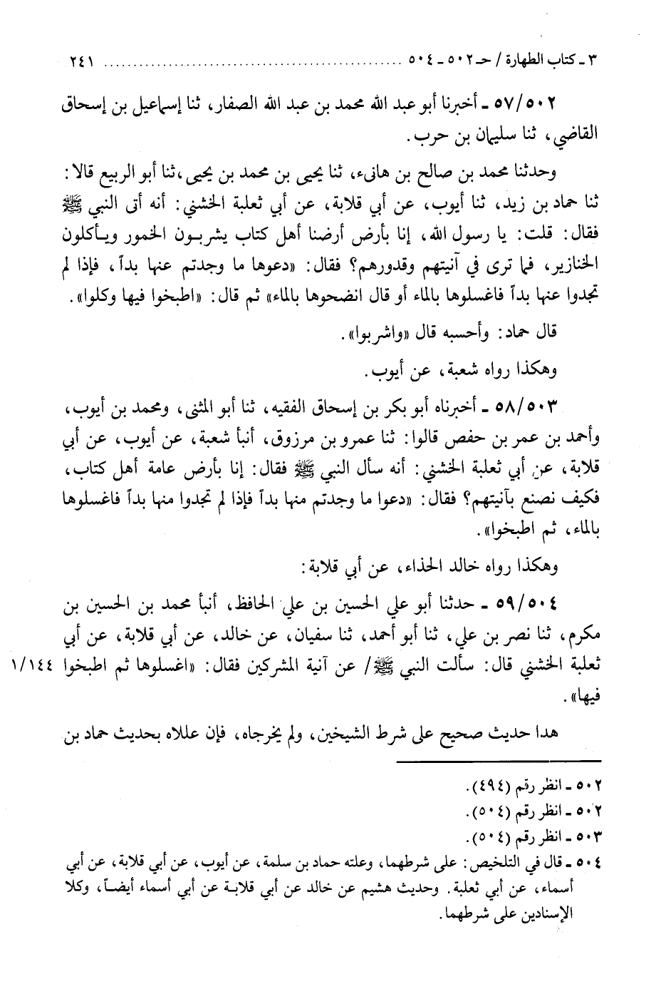 502 - أَخْبَرَنَا أَبُو عَبْدِ اللَّهِ مُحَمَّدُ بْنُ عَبْدِ اللَّهِ الصَّفَّارُ، ثنا إِسْمَاعِيلُ بْنُ إِسْحَاقَ الْقَاضِي، ثنا سُلَيْمَانُ بْنُ حَرْبٍ، وَحَدَّثَنَا مُحَمَّدُ بْنُ صَالِحِ بْنِ هَانِئٍ، ثنا يَحْيَى بْنُ مُحَمَّدِ بْنِ يَحْيَى، ثنا أَبُو الرَّبِيعِ، قَالَا: ثنا حَمَّادُ بْنُ زَيْدٍ، ثنا أَيُّوبُ، عَنْ أَبِي قِلَابَةَ، عَنْ أَبِي ثَعْلَبَةَ الْخُشَنِيِّ، أَنَّهُ أَتَى النَّبِيَّ صَلَّى اللهُ عَلَيْهِ وَسَلَّمَ، فَقَالَ: قُلْتُ: يَا رَسُولَ اللَّهِ إِنَّا بِأَرْضٍ أَرْضِ أَهْلِ الْكِتَابِ يَشْرَبُونَ الْخُمُورَ، وَيَأْكُلُونَ الْخَنَازِيرَ، فَمَا تَرَى فِي آنِيَتِهِمْ وَقُدُورِهِمْ؟ فَقَالَ: §«دَعُوهَا مَا وَجَدْتُمْ عَنْهَا بُدًّا، فَإِذَا لَمْ تَجِدُوا عَنْهَا بُدًّا فَاغْسِلُوهَا بِالْمَاءِ - أَوْ قَالَ انْضَحُوهَا بِالْمَاءِ -» ثُمَّ قَالَ: «اطْبُخُوا فِيهَا وَكُلُوا» قَالَ حَمَّادٌ: وَأَحْسِبُهُ قَالَ: «وَاشْرَبُوا» . وَهَكَذَا رَوَاهُ شُعْبَةُ، عَنْ أَيُّوبَ
