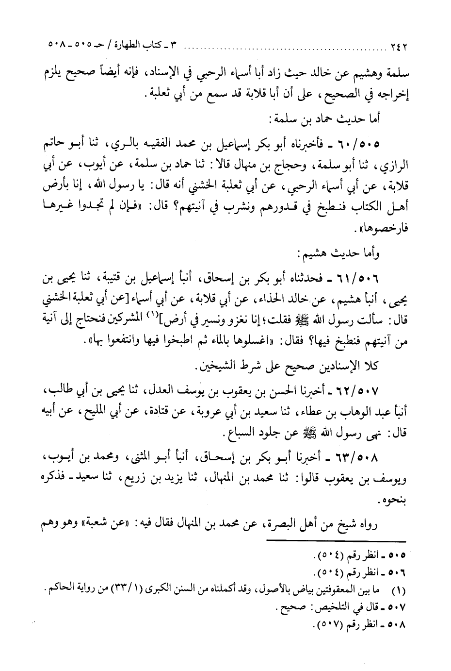 506 - فَحَدَّثَنَاهُ أَبُو بَكْرِ بْنُ إِسْحَاقَ، أَنْبَأَ إِسْمَاعِيلُ بْنُ قُتَيْبَةَ، ثنا يَحْيَى بْنُ يَحْيَى، أَنْبَأَ هُشَيْمٌ، عَنْ خَالِدٍ الْحَذَّاءِ، عَنْ أَبِي قِلَابَةَ، عَنْ أَبِي أَسْمَاءَ، عَنْ أَبِي ثَعْلَبَةَ الْخُشَنِيِّ، قَالَ: سَأَلْتُ رَسُولَ اللَّهِ صَلَّى اللهُ عَلَيْهِ وَسَلَّمَ فَقُلْتُ: إِنَّا نَغْزُو وَنَسِيرُ فِي أَرْضِ الْمُشْرِكِينَ فَنَحْتَاجُ إِلَى آنِيَةٍ مِنْ آنِيَتِهِمْ فَنَطْبُخُ فِيهَا، فَقَالَ: «§اغْسِلُوهَا بِالْمَاءِ، ثُمَّ اطْبُخُوا فِيهَا، وَانْتَفِعُوا بِهَا» . «كِلَا الْإِسْنَادَيْنِ صَحِيحٌ عَلَى شَرْطِ الشَّيْخَيْنِ»
