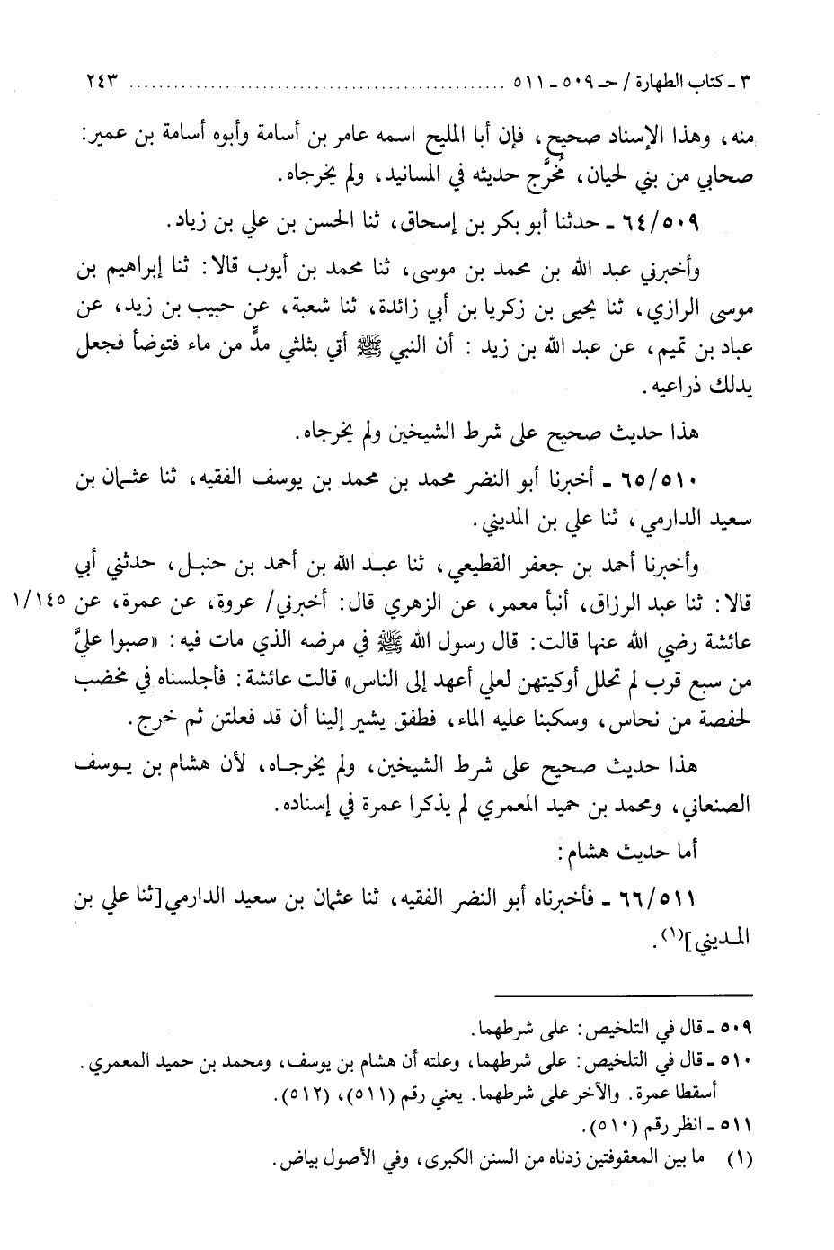 510 - أَخْبَرَنَا أَبُو النَّضْرِ مُحَمَّدُ بْنُ مُحَمَّدِ بْنِ يُوسُفَ الْفَقِيهُ، ثنا عُثْمَانُ بْنُ سَعِيدٍ الدَّارِمِيُّ، ثنا عَلِيُّ بْنُ الْمَدِينِيِّ، وَأَخْبَرَنَا أَحْمَدُ بْنُ جَعْفَرٍ الْقَطِيعِيُّ، ثنا عَبْدُ اللَّهِ بْنُ أَحْمَدَ بْنِ حَنْبَلٍ، حَدَّثَنِي أَبِي، قَالَا: ثنا عَبْدُ الرَّزَّاقِ، أَنْبَأَ مَعْمَرٌ، عَنِ الزُّهْرِيِّ، قَالَ: أَخْبَرَنِي عُرْوَةُ، عَنْ عَمْرَةَ، عَنْ عَائِشَةَ رَضِيَ اللَّهُ عَنْهَا، قَالَتْ: قَالَ رَسُولُ اللَّهِ صَلَّى اللهُ عَلَيْهِ وَسَلَّمَ فِي مَرَضِهِ الَّذِي مَاتَ فِيهِ: §«صُبُّوا عَلَيَّ مِنْ سَبْعِ قِرَبٍ لَمْ تُحْلَلْ أَوْكِيَتُهُنَّ لَعَلِّي أَعْهَدُ إِلَى النَّاسِ» قَالَتْ عَائِشَةُ: فَأَجْلَسْنَاهُ فِي مِخْضَبٍ لِحَفْصَةَ مِنْ نُحَاسٍ، وَسَكَبْنَا عَلَيْهِ الْمَاءَ، فَطَفِقَ يُشِيرُ إِلَيْنَا أَنْ قَدْ فَعَلْتُنَّ ثُمَّ خَرَجَ. «هَذَا حَدِيثٌ صَحِيحٌ عَلَى شَرْطِ الشَّيْخَيْنِ، وَلَمْ يُخَرِّجَاهُ لِأَنَّ هِشَامَ بْنَ يُوسُفَ الصَّنْعَانِيَّ وَمُحَمَّدَ بْنَ حُمَيْدٍ الْمَعْمَرِيَّ لَمْ يَذْكُرَا عَمْرَةَ فِي إِسْنَادِهِ» K510 - على شرطهما