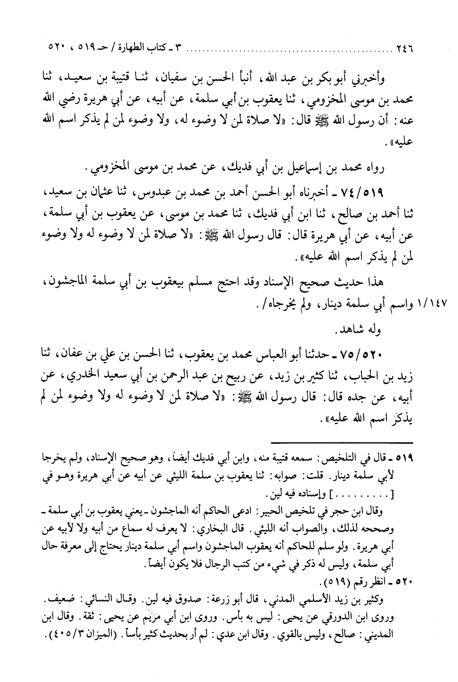 520 - حَدَّثَنَا أَبُو الْعَبَّاسِ مُحَمَّدُ بْنُ يَعْقُوبَ، ثنا الْحَسَنُ بْنُ عَلِيِّ بْنِ عَفَّانَ، ثنا زَيْدُ بْنُ الْحُبَابِ، ثنا كَثِيرُ بْنُ زَيْدٍ، عَنْ رُبَيْحِ بْنِ عَبْدِ الرَّحْمَنِ بْنِ أَبِي سَعِيدٍ الْخُدْرِيِّ، عَنْ أَبِيهِ، عَنْ جَدِّهِ، قَالَ: قَالَ رَسُولُ اللَّهِ صَلَّى اللهُ عَلَيْهِ وَسَلَّمَ: «§لَا صَلَاةَ لِمَنْ لَا وُضُوءَ لَهُ، وَلَا وُضُوءَ لِمَنْ لَمْ يَذْكُرِ اسْمَ اللَّهِ عَلَيْهِ» . فَأَخْبَرَنِي عَلِيُّ بْنُ بُنْدَارٍ الزَّاهِدُ، ثنا عُمَرُ بْنُ مُحَمَّدِ بْنِ جُبَيْرٍ، ثنا أَبُو بَكْرٍ الْأَثْرَمُ. وَقَالَ: سَمِعْتُ أَحْمَدَ بْنَ حَنْبَلٍ، وَسُئِلَ عَمَّنْ يَتَوَضَّأُ وَلَا يُسَمِّي فَقَالَ أَحْمَدُ: أَحْسَنُ مَا يُرْوَى فِي هَذَا الْحَدِيثِ كَثِيرُ بْنُ زَيْدٍ